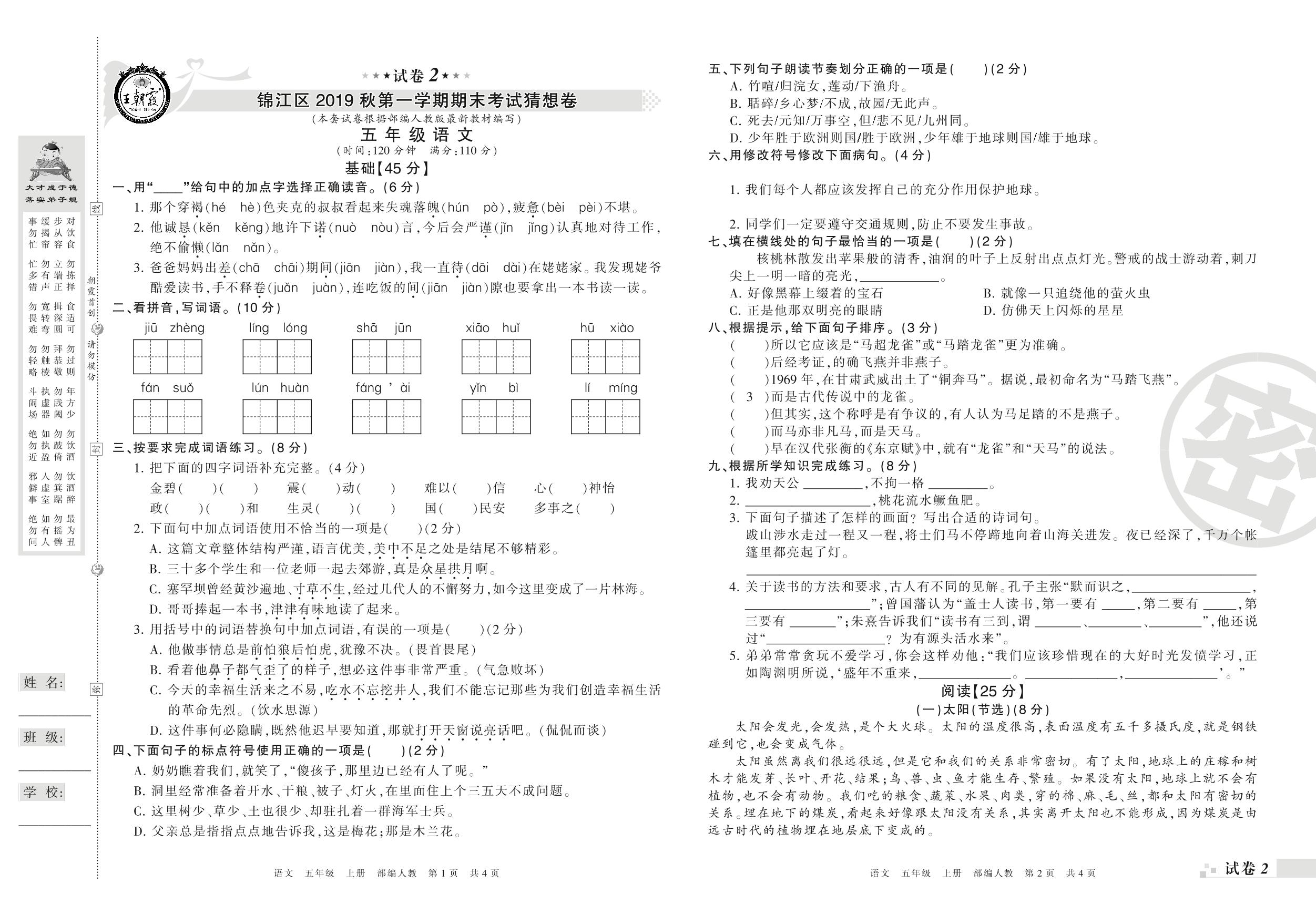 2018-2019学年第一学期成都市锦江区猜想卷五年级语文试卷(人教版)【2】