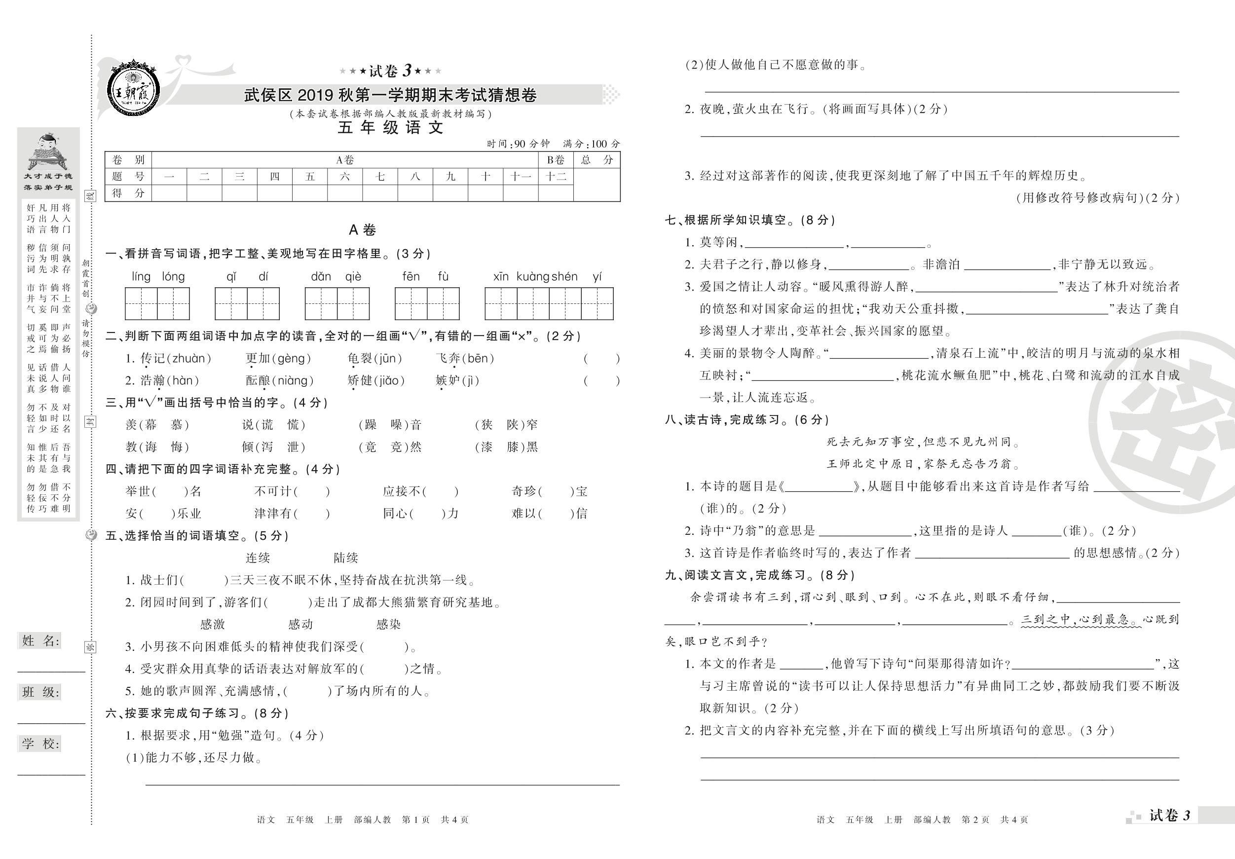 2018-2019学年第一学期成都市武侯区猜想卷五年级语文试卷(人教版)【3】