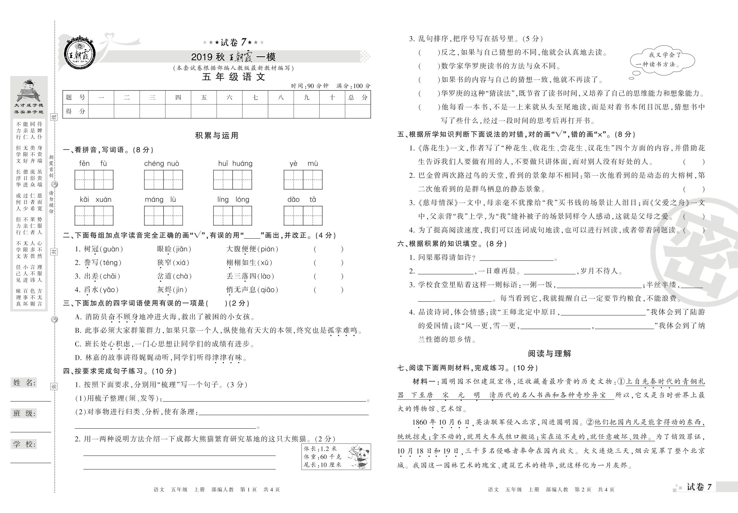 王朝霞期末模拟卷五年级上册语文(人教版)_R210801195513【7】