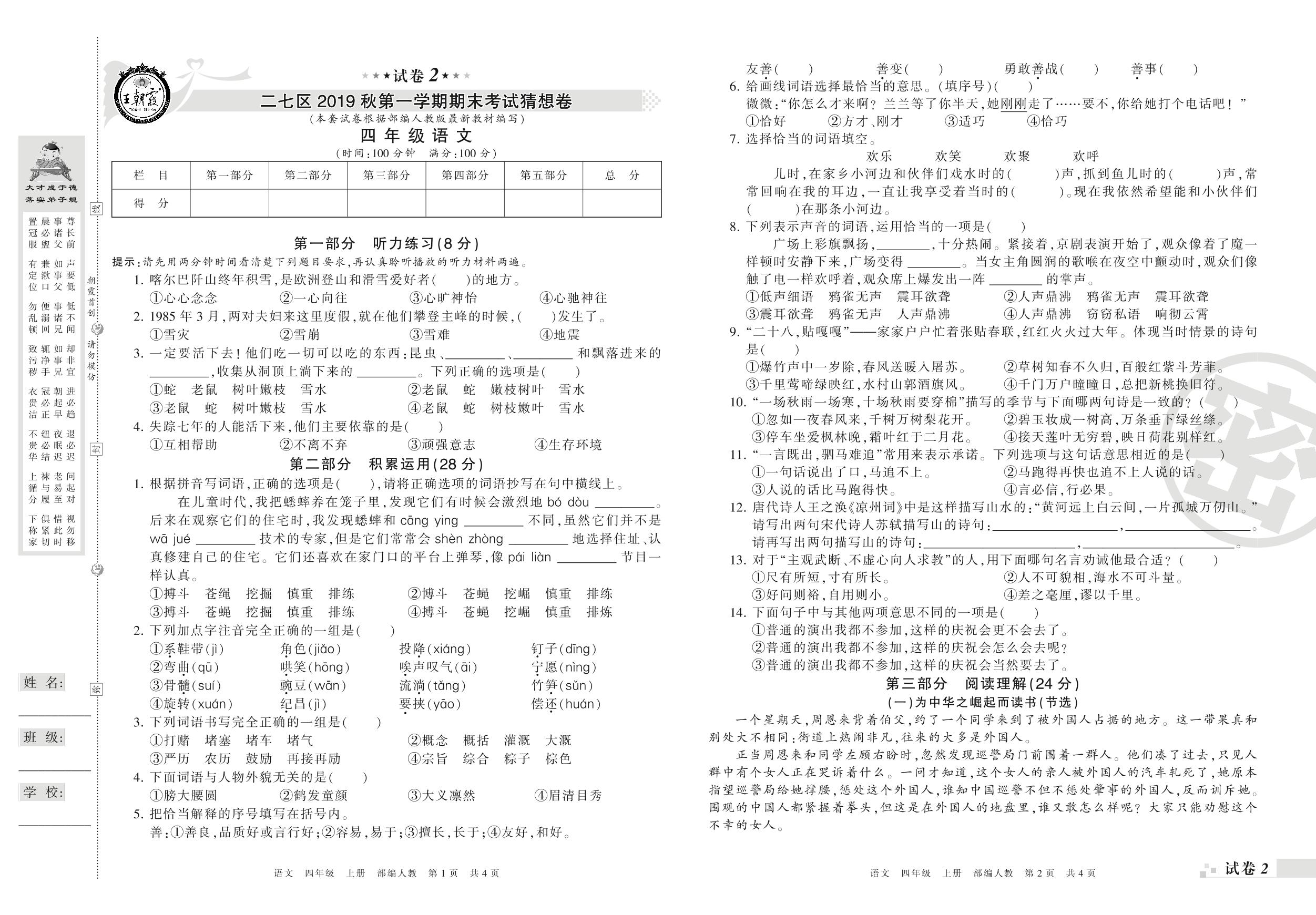 2018-2019学年第一学期郑州市二七区猜想卷四年级语文试卷(人教版)_R210801195542【2】