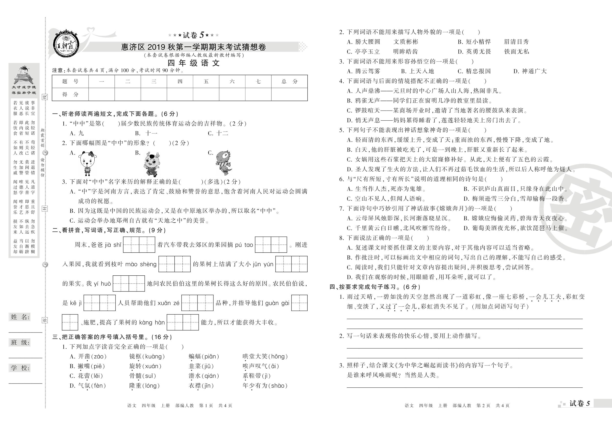 2018-2019学年第一学期郑州市惠济区猜想卷四年级语文试卷(人教版)【5】