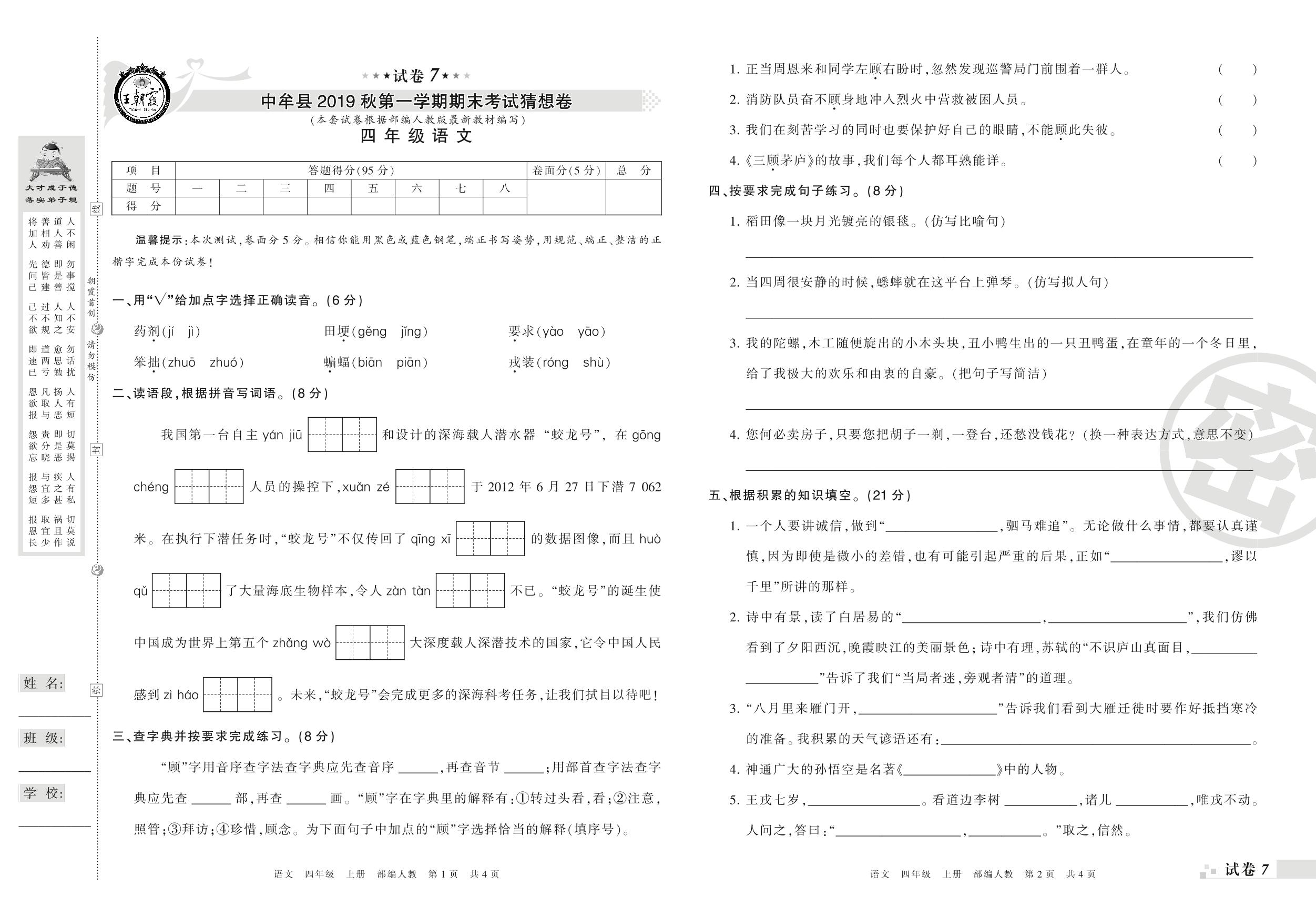 2018-2019学年第一学期郑州市中牟县猜想卷四年级语文试卷(人教版)【7】