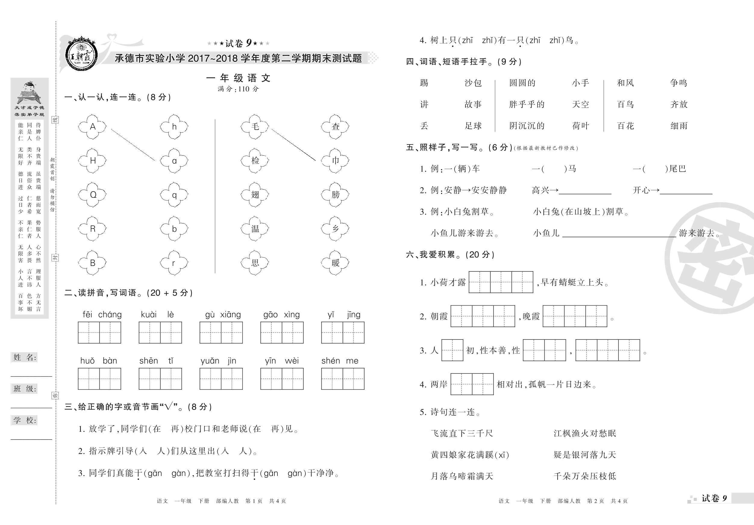 2017-2018学年第二学期承德市实验小学一年级语文试卷(人教版)【9】