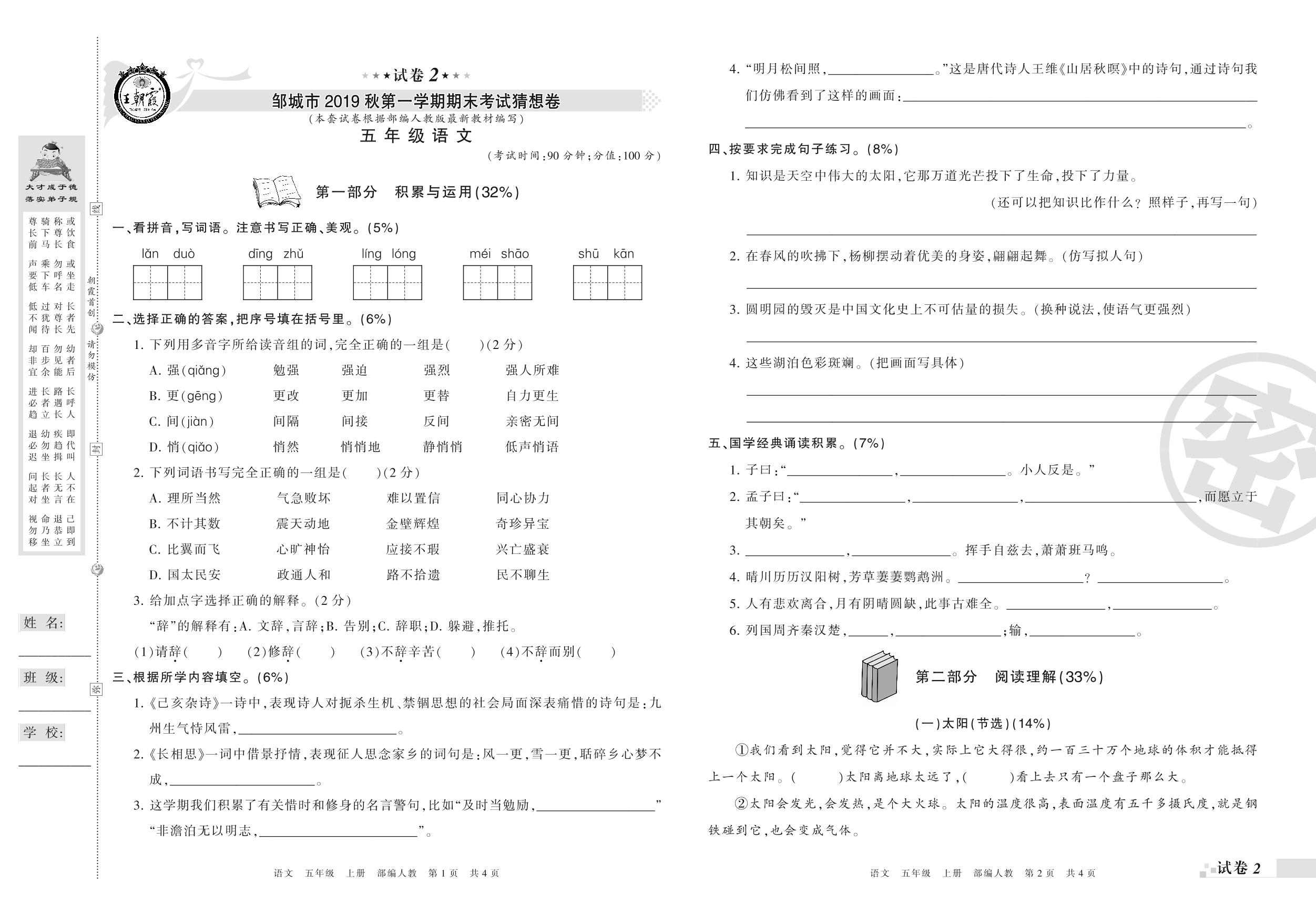 2018-2019学年第一学期邹城市猜想卷五年级语文试卷(人教版)【2】
