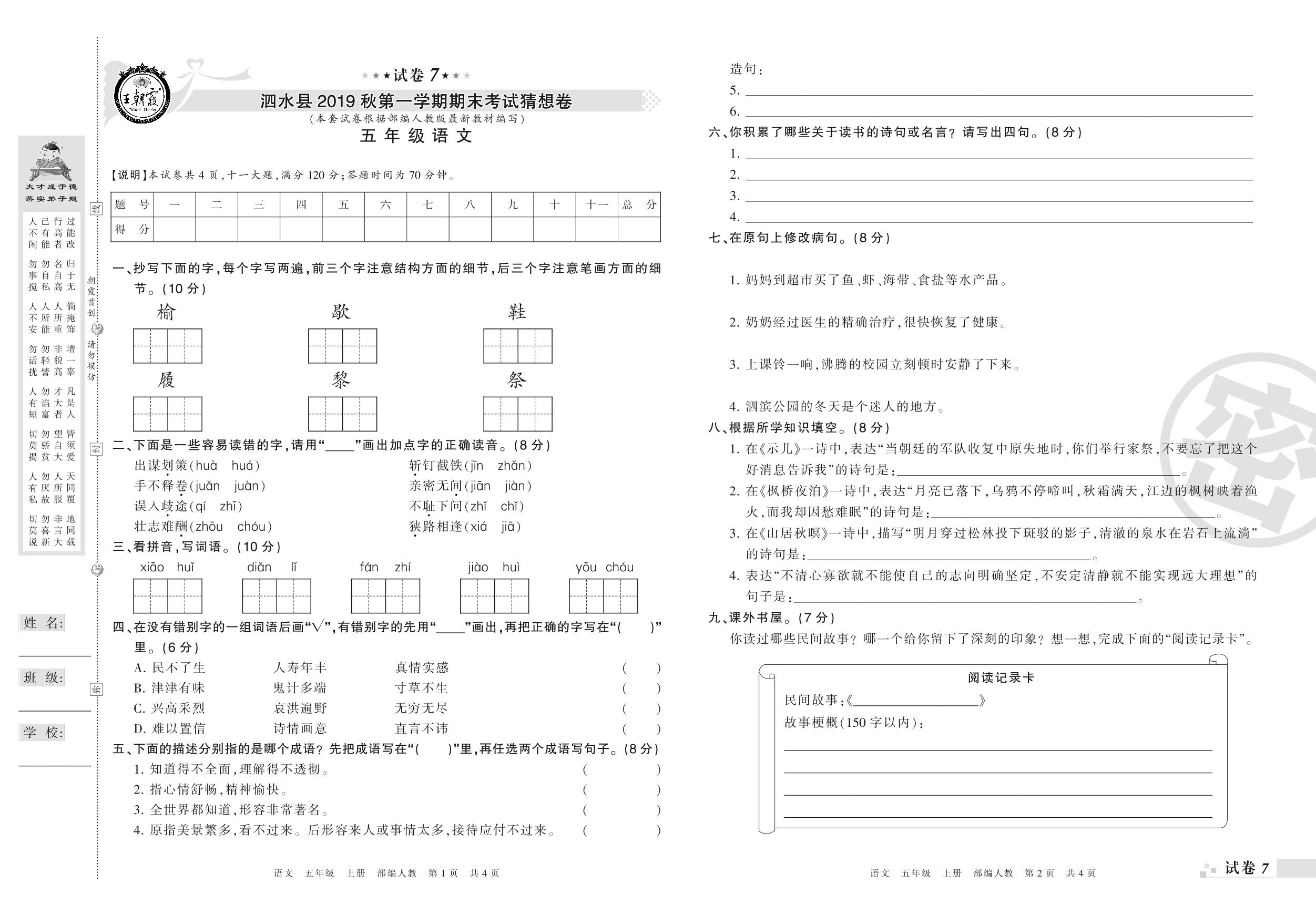 2018-2019学年第一学期济宁市泗水县猜想卷五年级语文试卷(人教版)【7】
