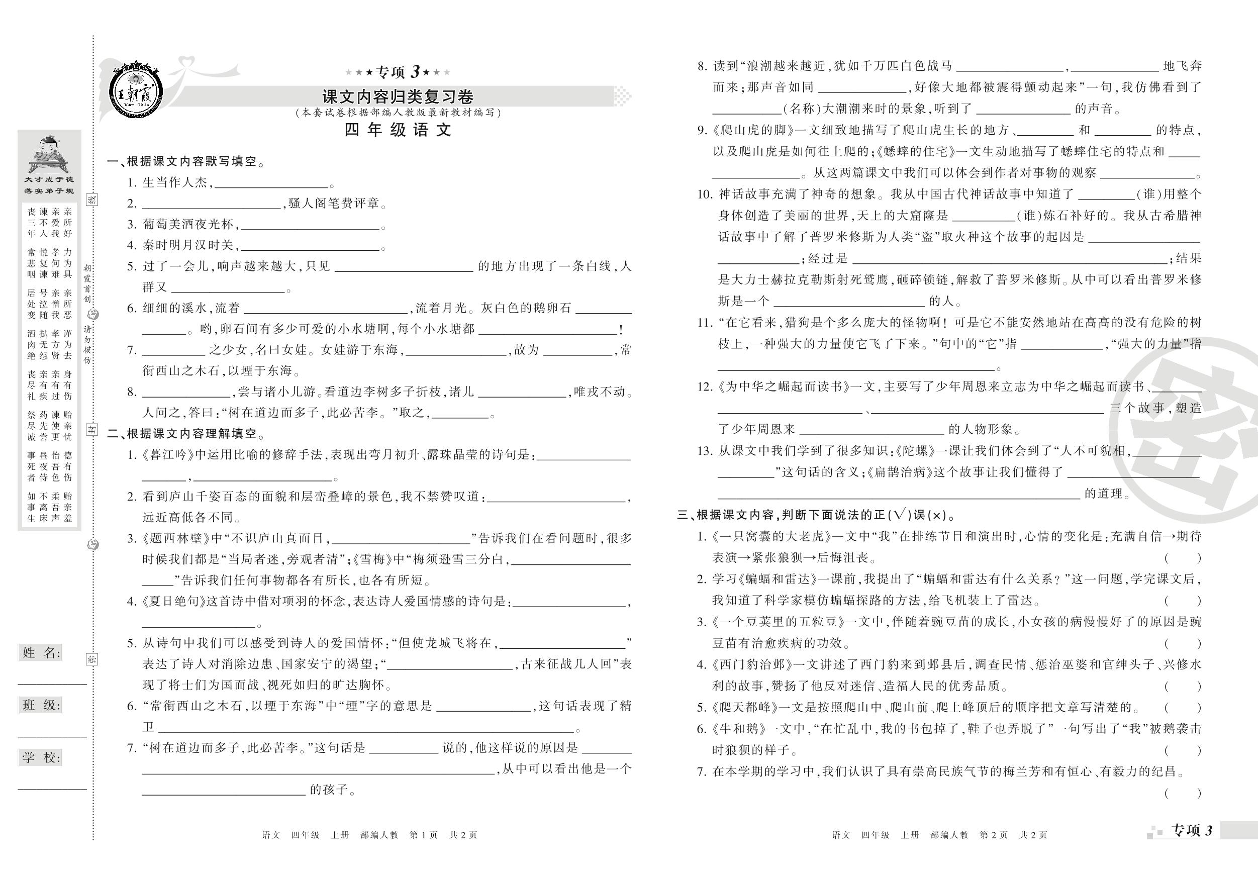 王朝霞期末专项卷——课文内容、积累运用真题归类复习卷四年级上册语文(人教版)_R210801195710【0】