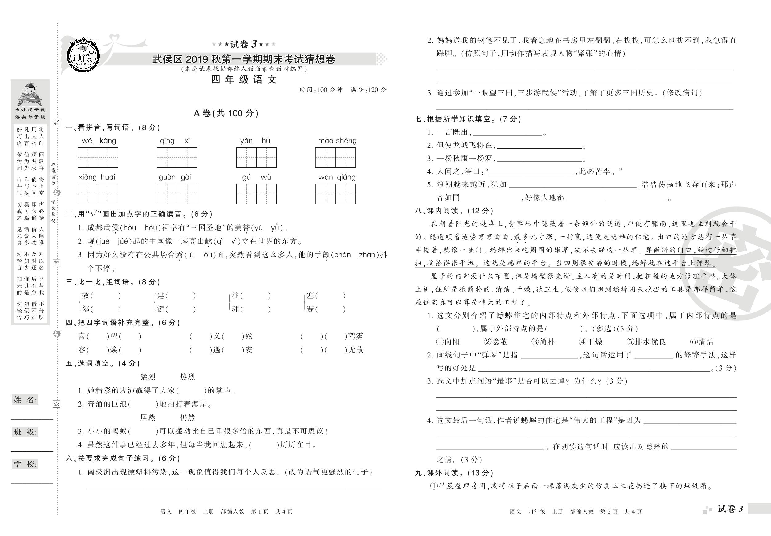 2018-2019学年第一学期成都市武侯区猜想卷四年级语文试卷(人教版)【3】