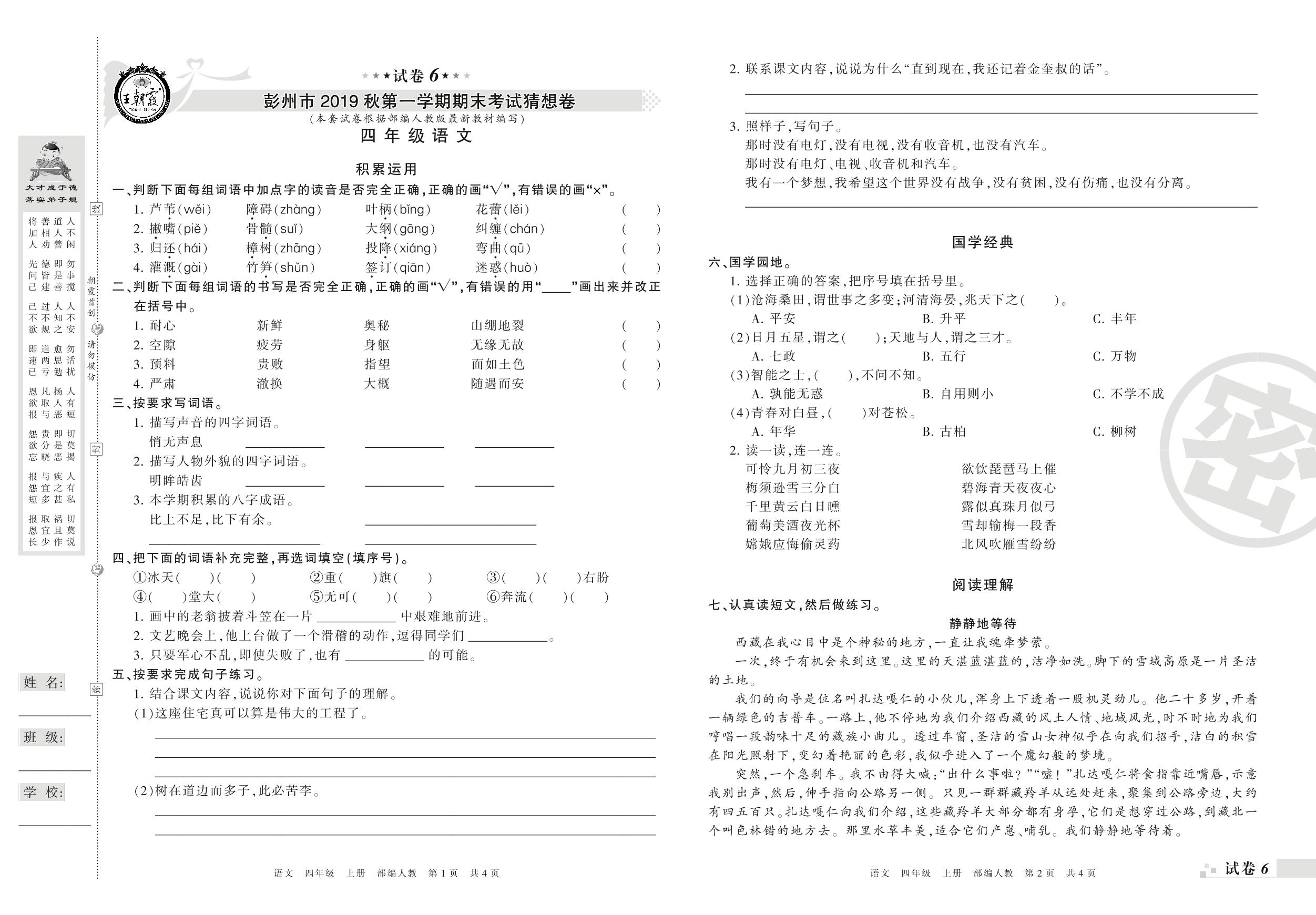 2018-2019学年第一学期彭州市猜想卷四年级语文试卷(人教版)【6】