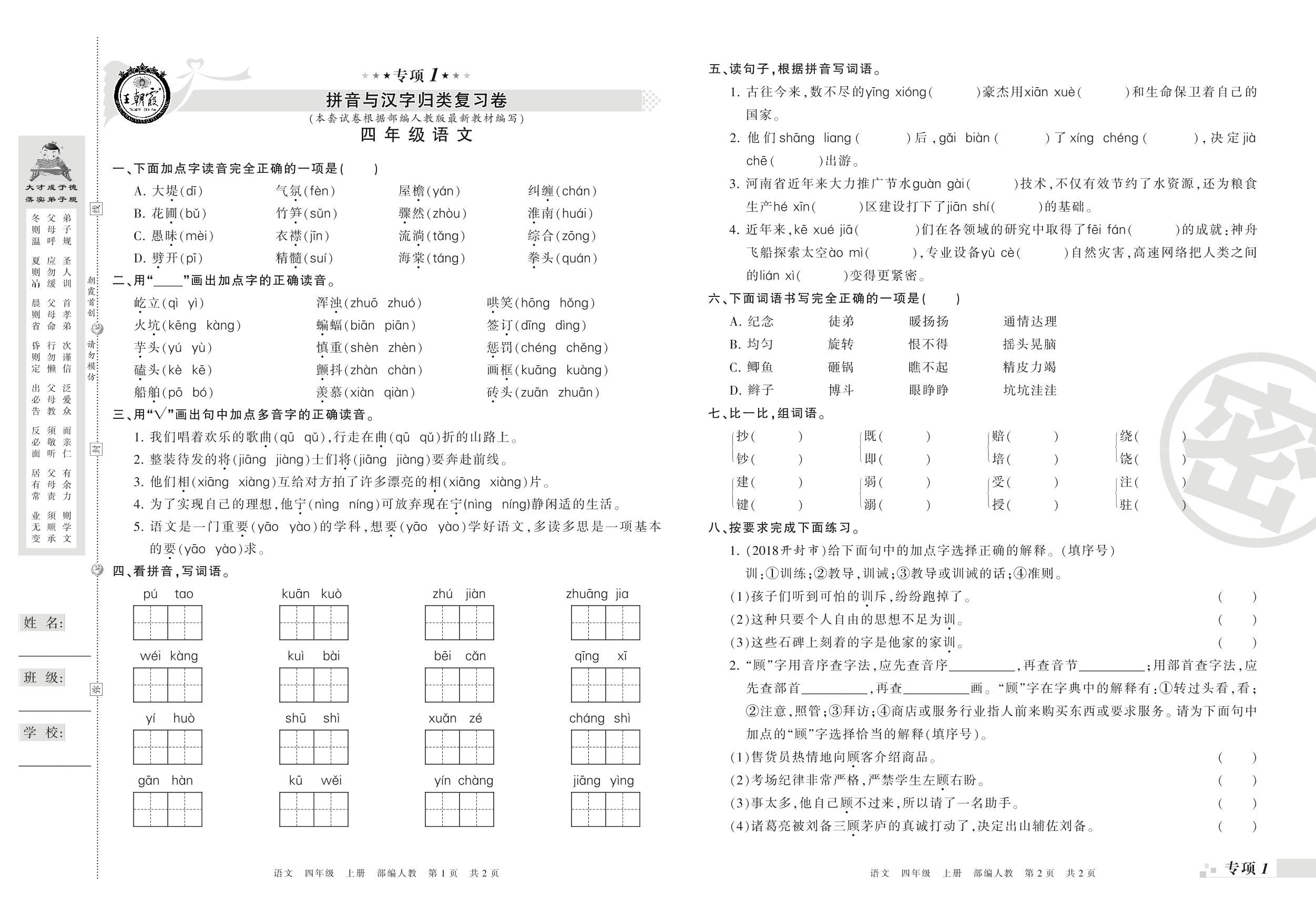 王朝霞期末专项卷——拼音与汉字、词语归类复习四年级上册语文(人教版)_R210801195835【0】