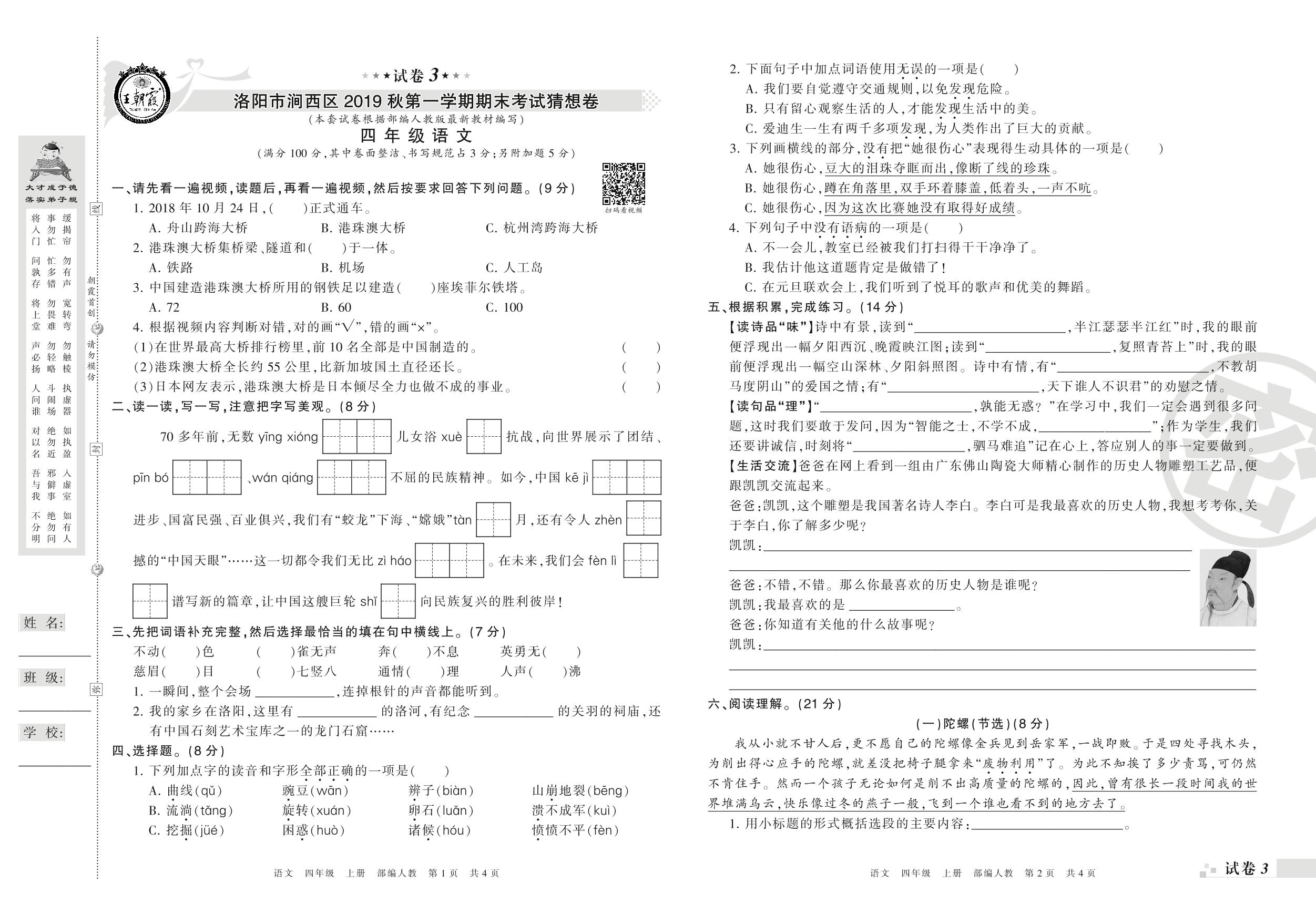 2019-2020学年第一学期洛阳市涧西区猜想卷四年级语文试卷(人教版)【3】