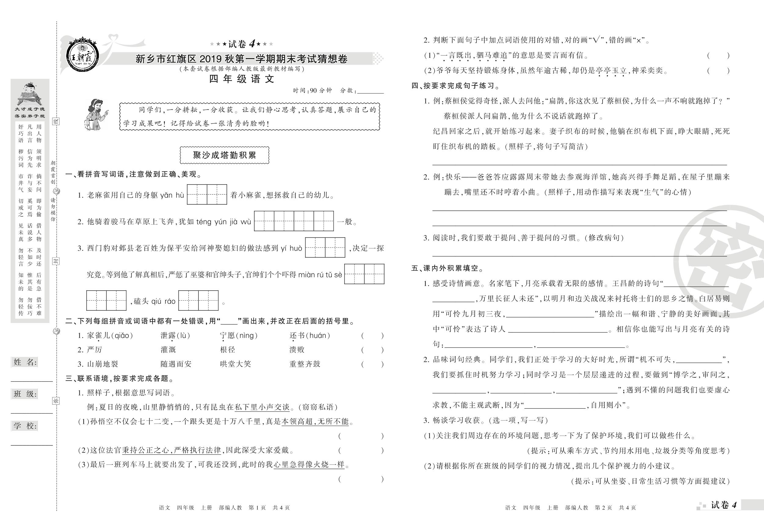 2019-2020学年第一学期新乡市红旗区猜想卷四年级语文试卷(人教版)【4】