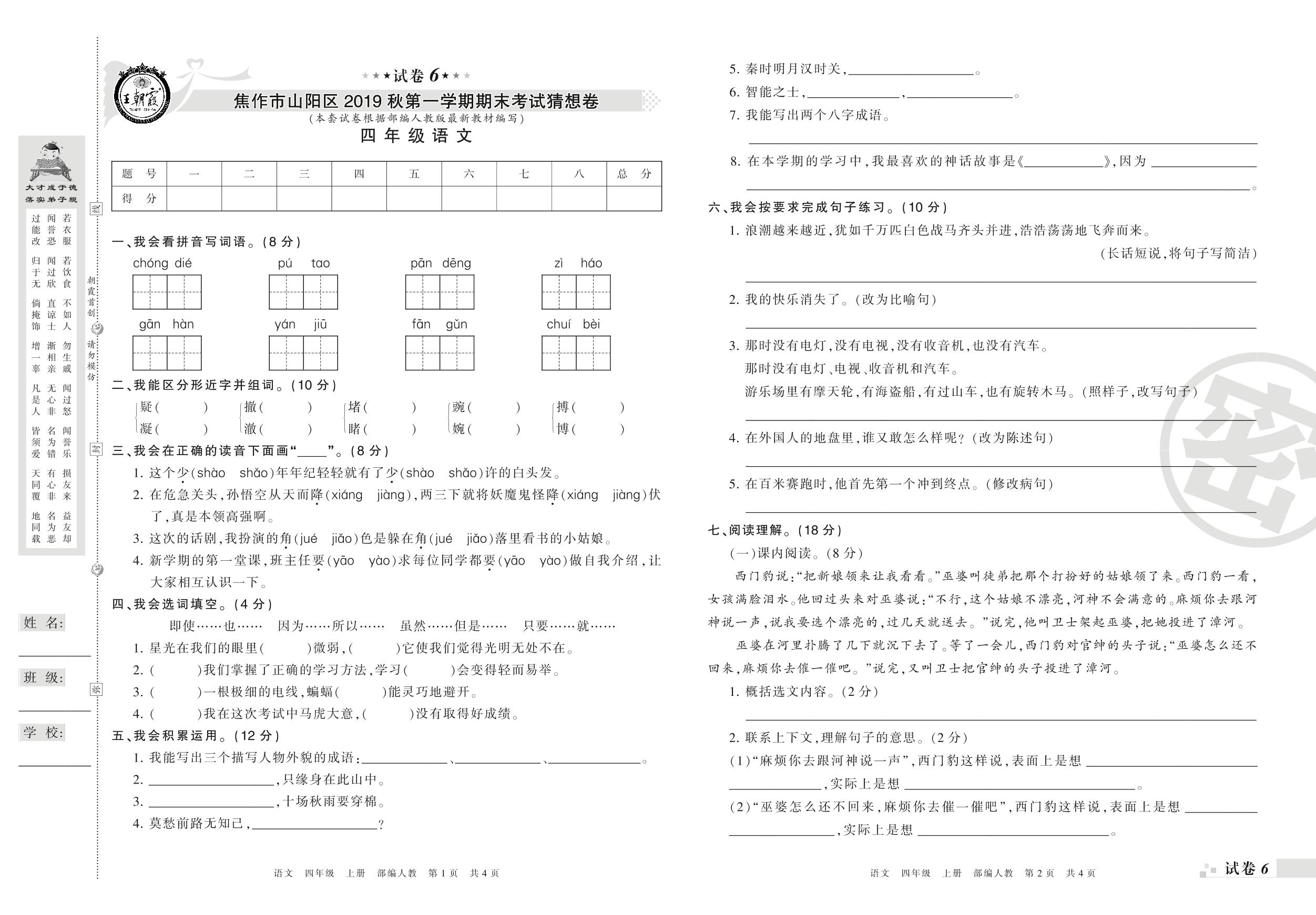 2019-2020学年第一学期焦作市山阳区猜想卷四年级语文试卷(人教版)【6】