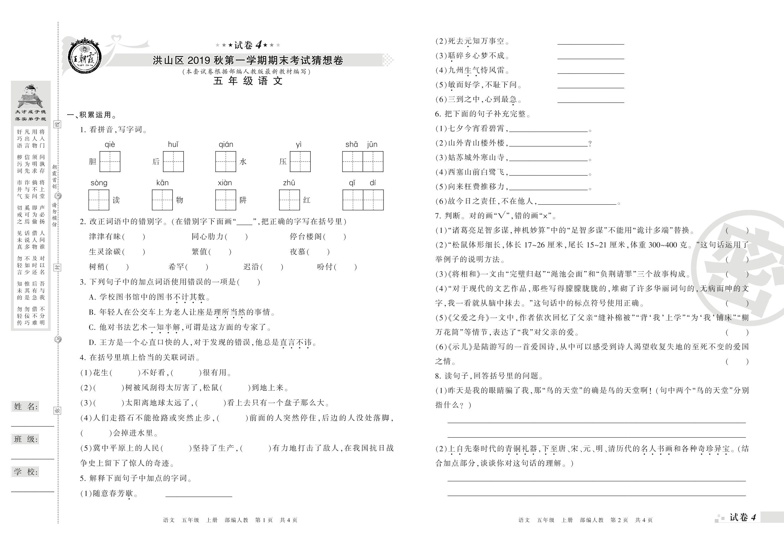 2019-2020学年第一学期武汉市洪山区猜想卷五年级语文试卷(人教版)【4】