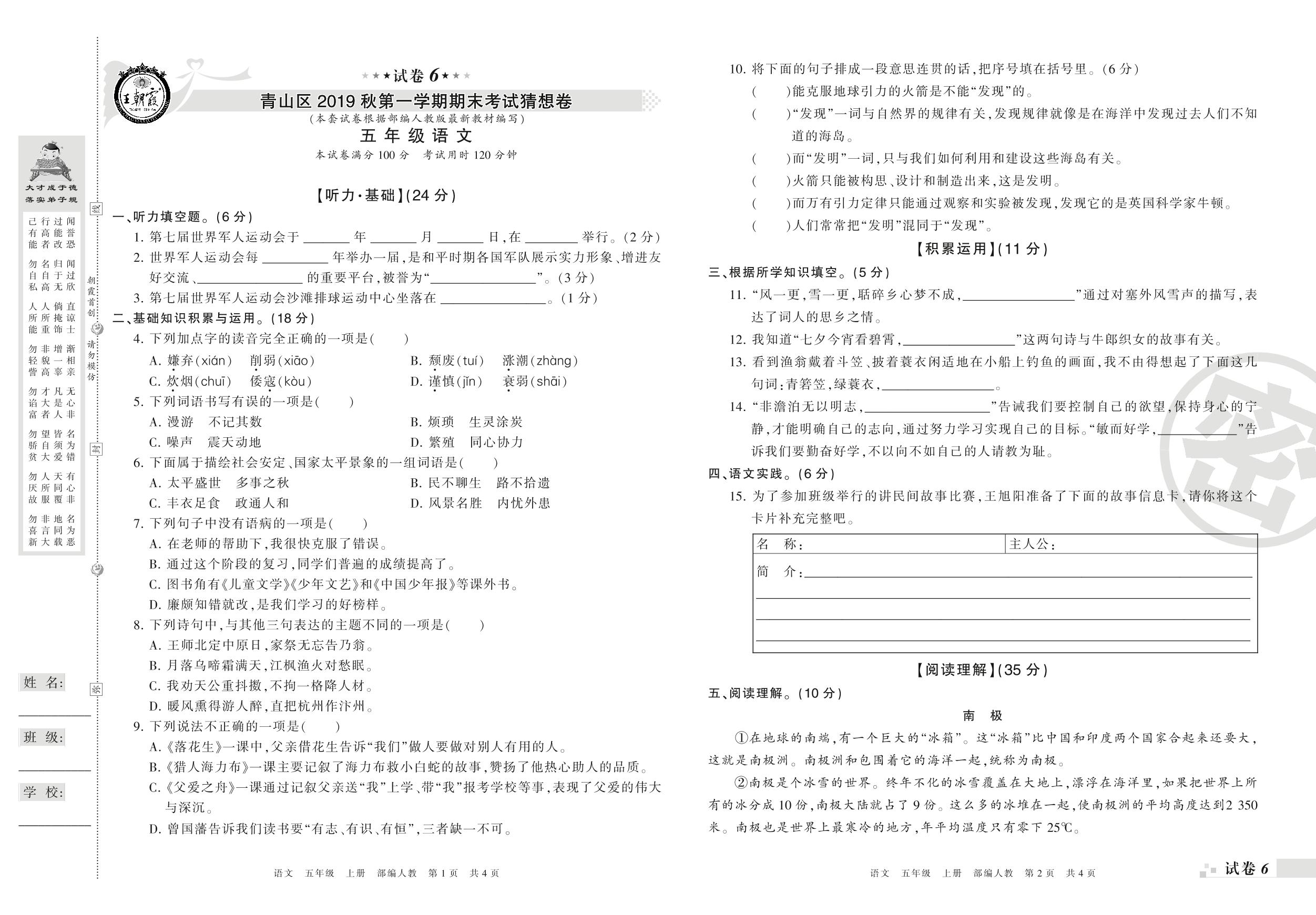 2019-2020学年第一学期武汉市青山区猜想卷五年级语文试卷(人教版)【6】