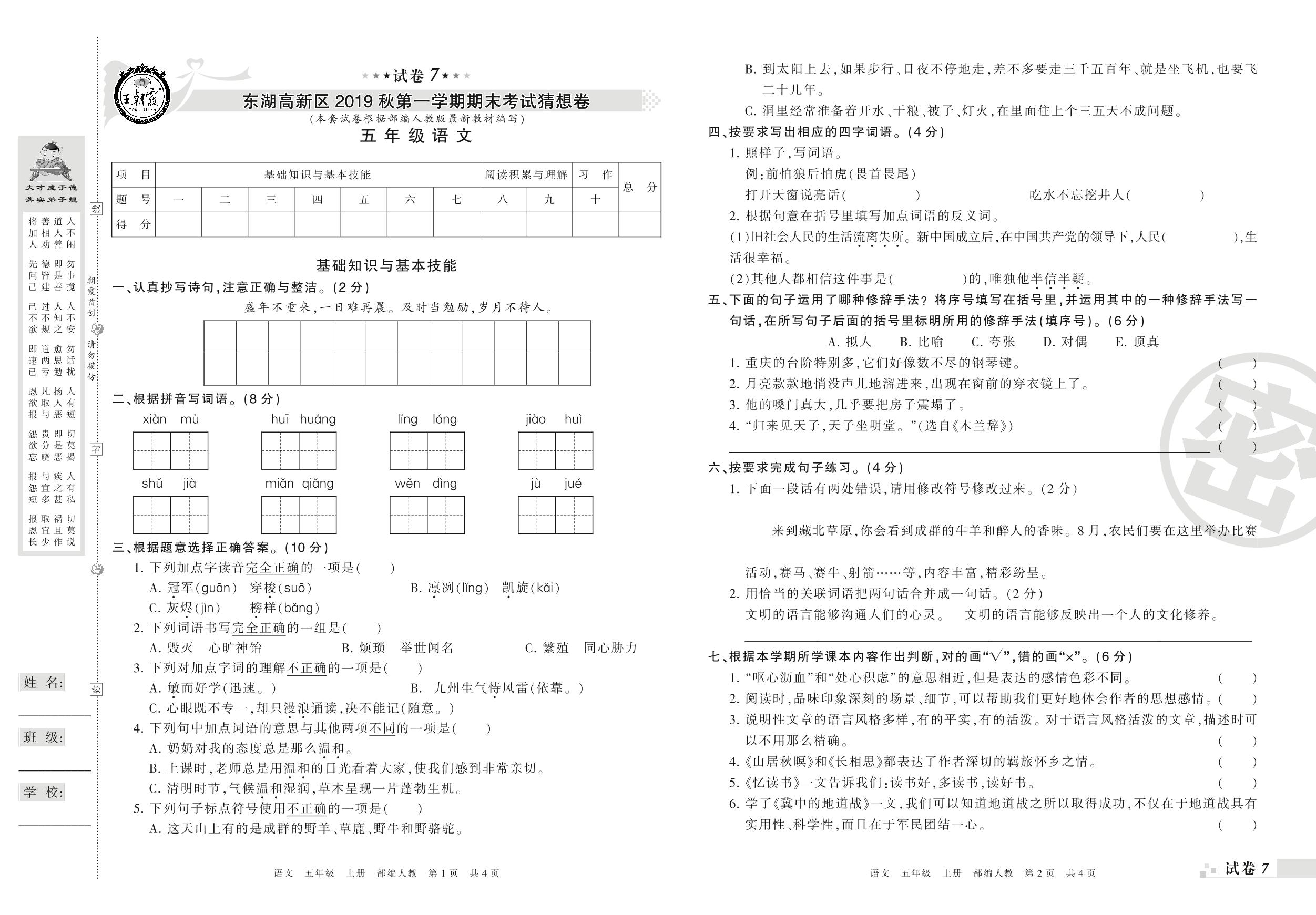 2019-2020学年第一学期武汉市东湖高新区猜想卷五年级语文试卷(人教版)【7】