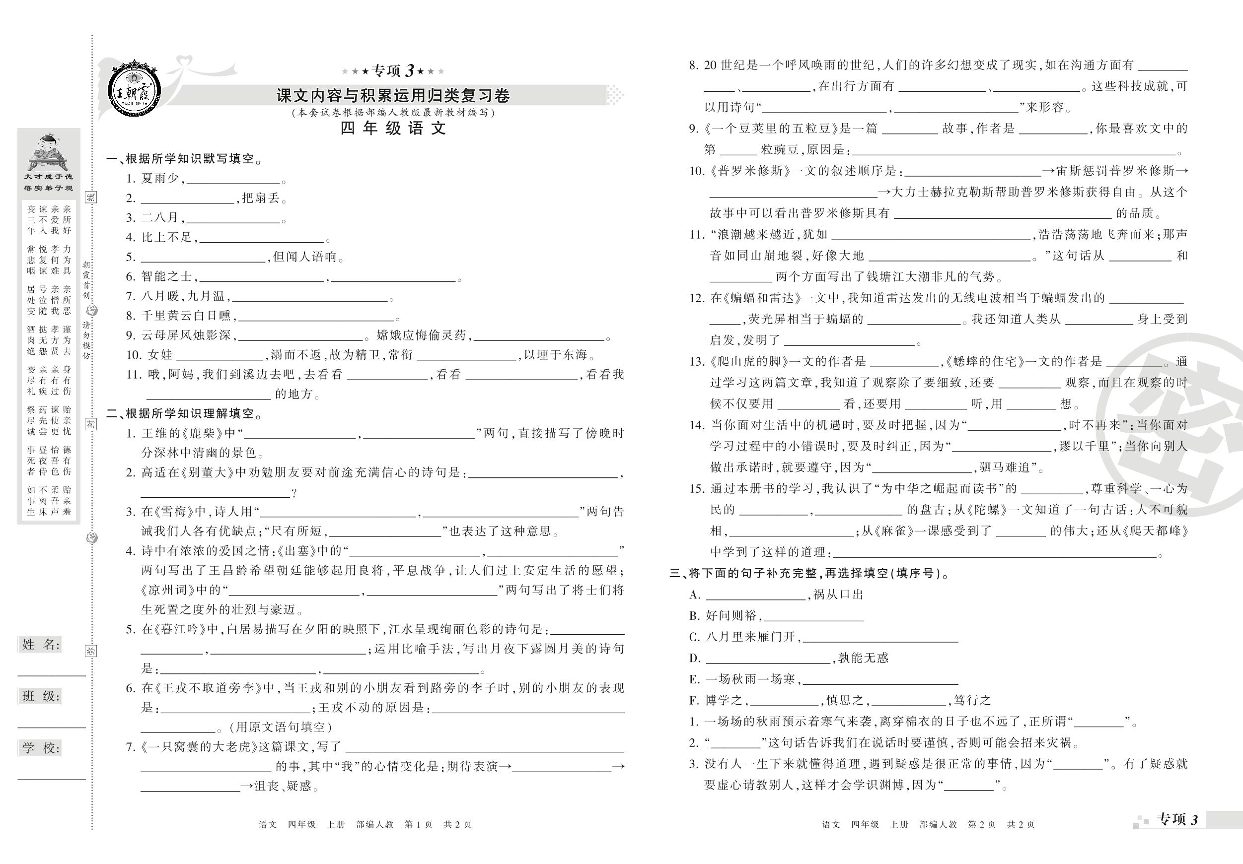 王朝霞期末专项卷——课文内容与积累运用、课内阅读与写作归类复习四年级上册语文(人教版)_R210801200016【0】