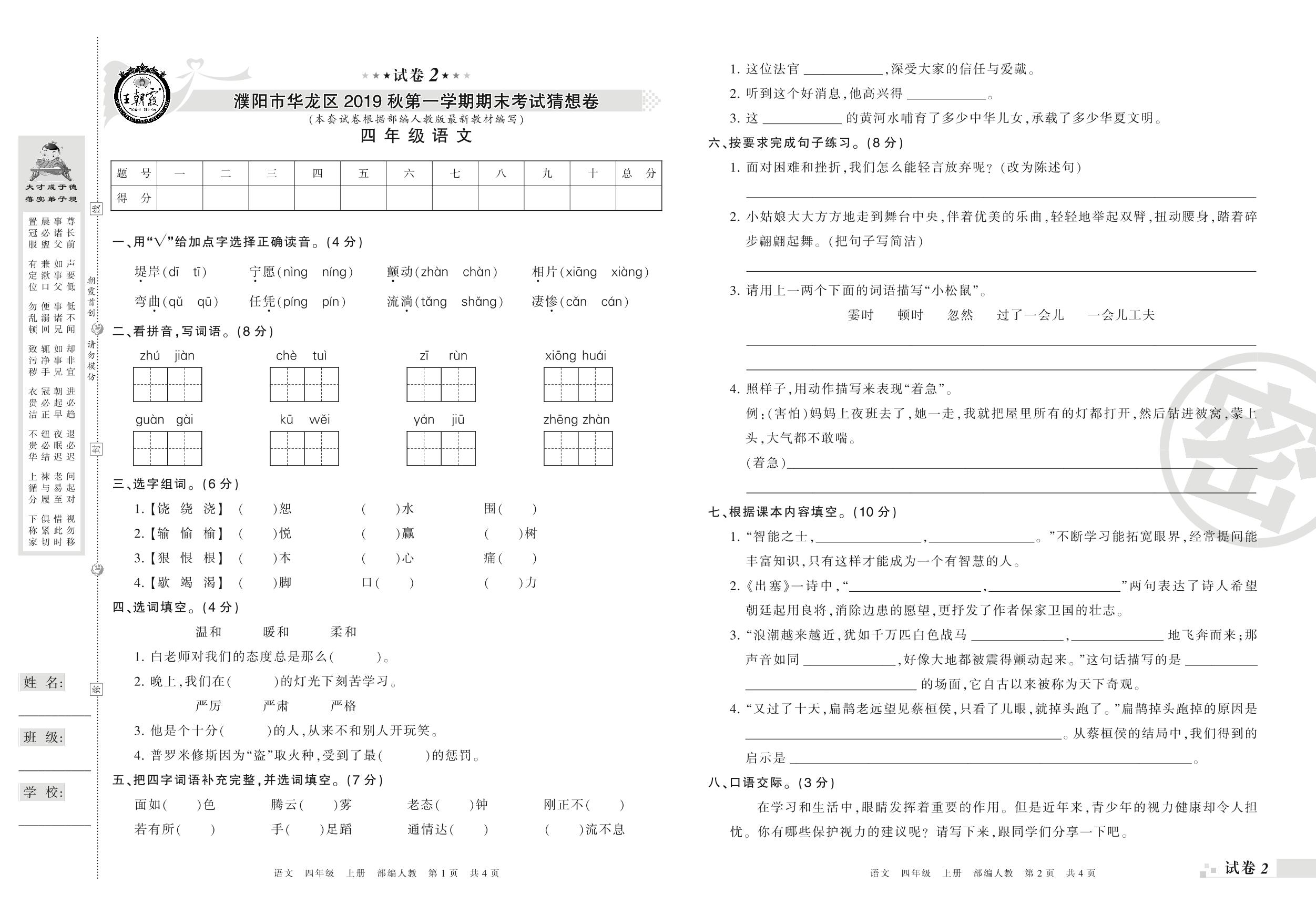 2019-2020学年第一学期濮阳市华龙区猜想卷四年级语文试卷(人教版)【2】