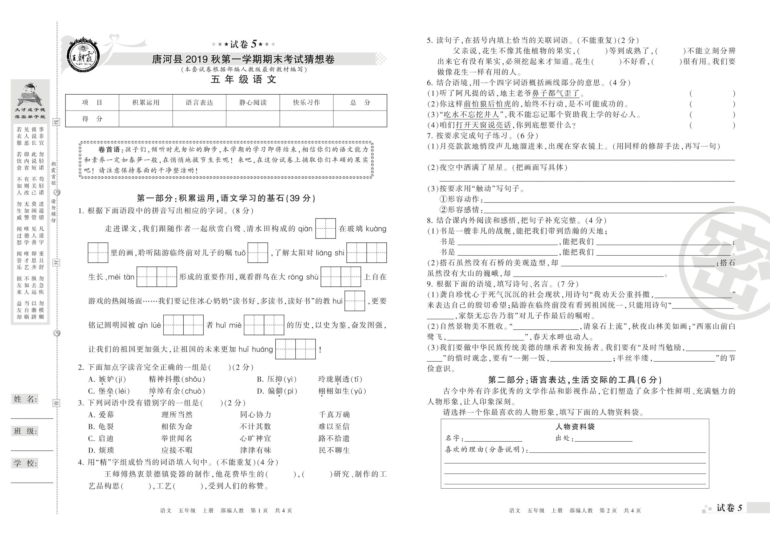 2019-2020学年第一学期南阳市唐河县猜想卷五年级语文试卷(人教版)【5】
