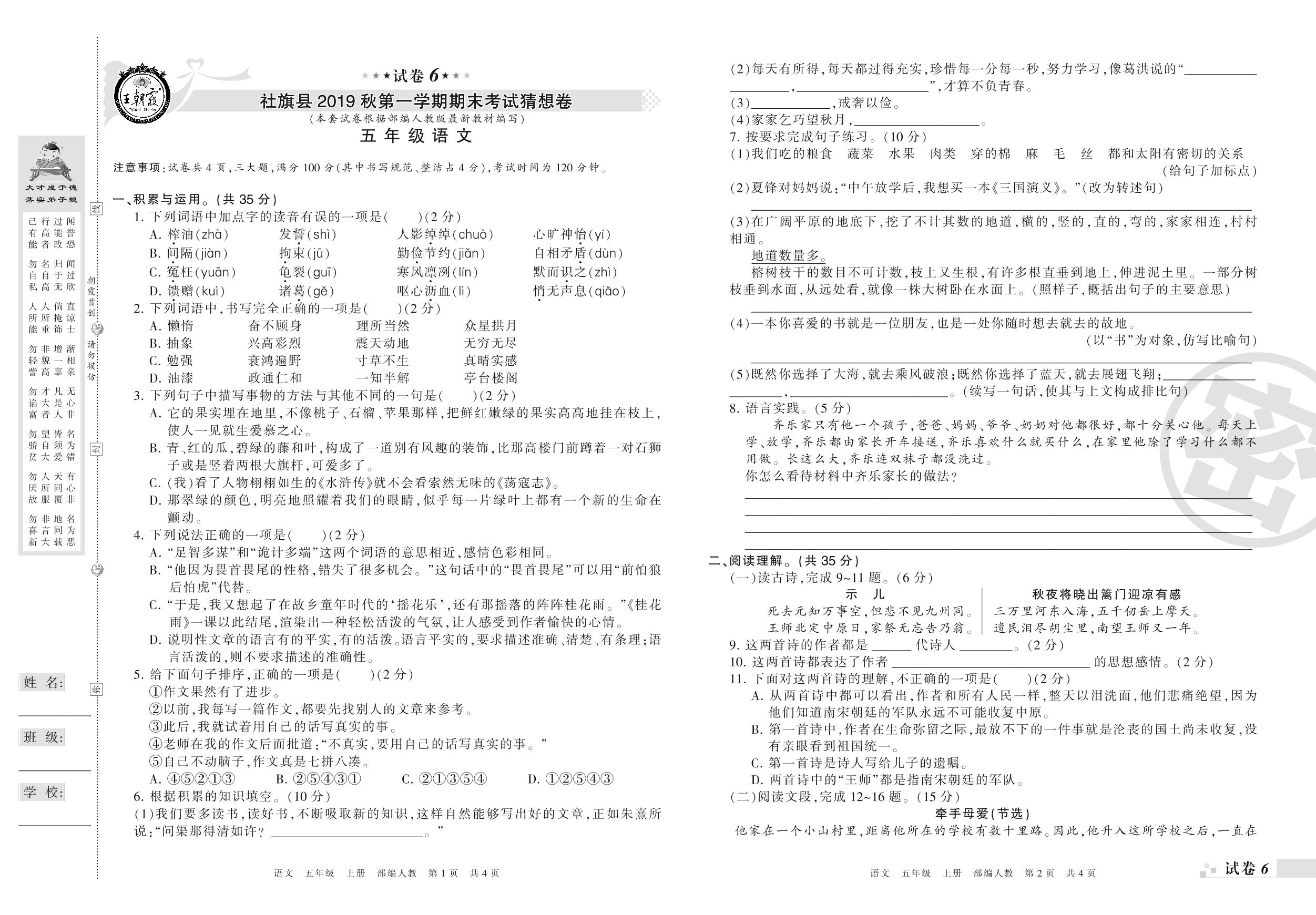 2019-2020学年第一学期南阳市社旗县猜想卷五年级语文试卷(人教版)【6】