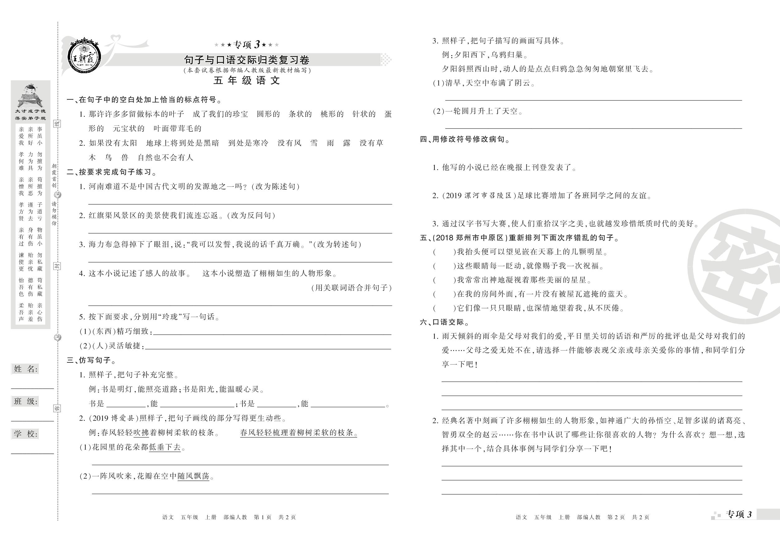 王朝霞期末专项卷——句子与口语交际、课文内容归类复习五年级上册语文(人教版)_R210801200137【0】