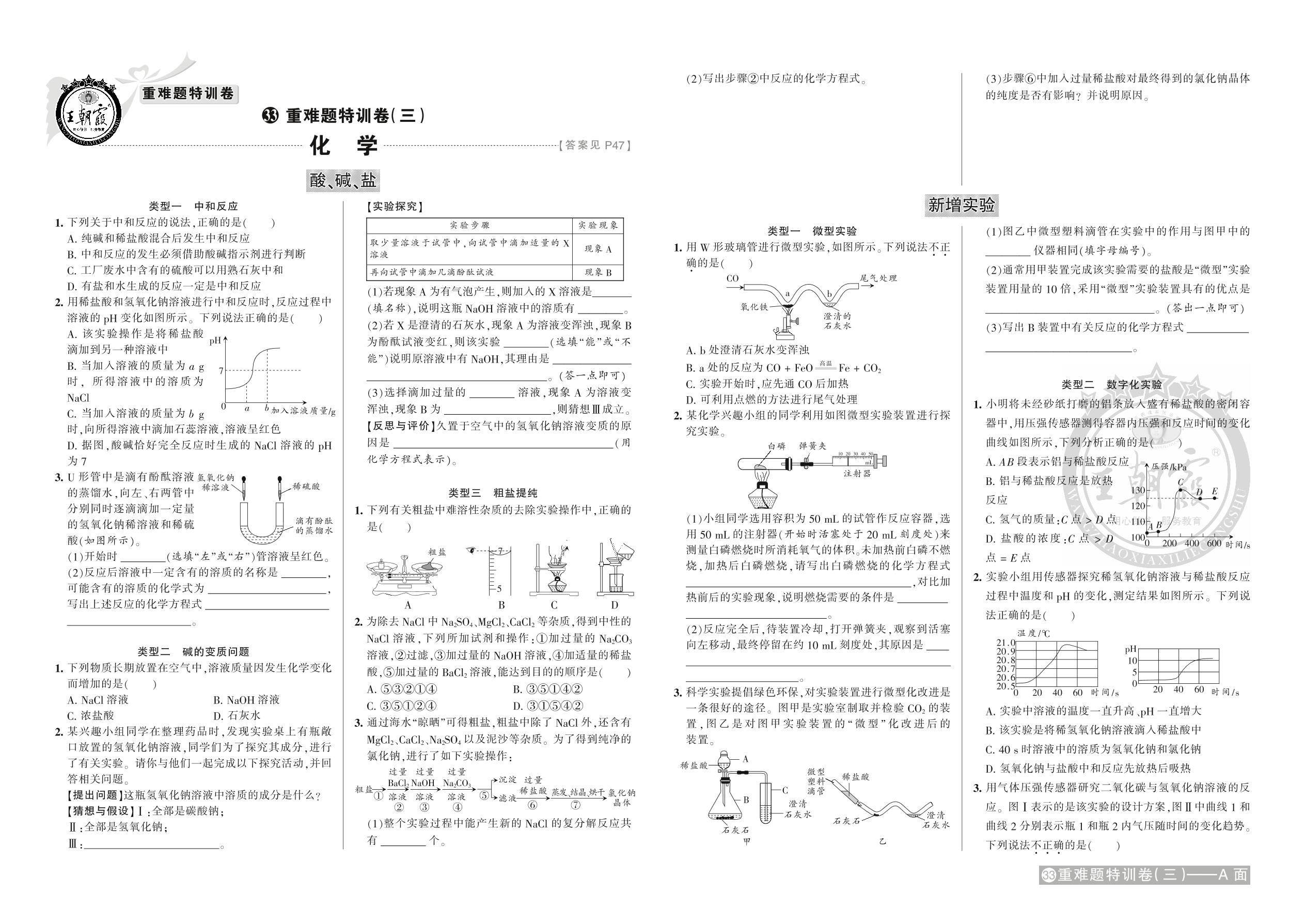 2021年河南中考化学重难题特训卷(三)酸、碱、盐 新增实验 综合应用题【33】
