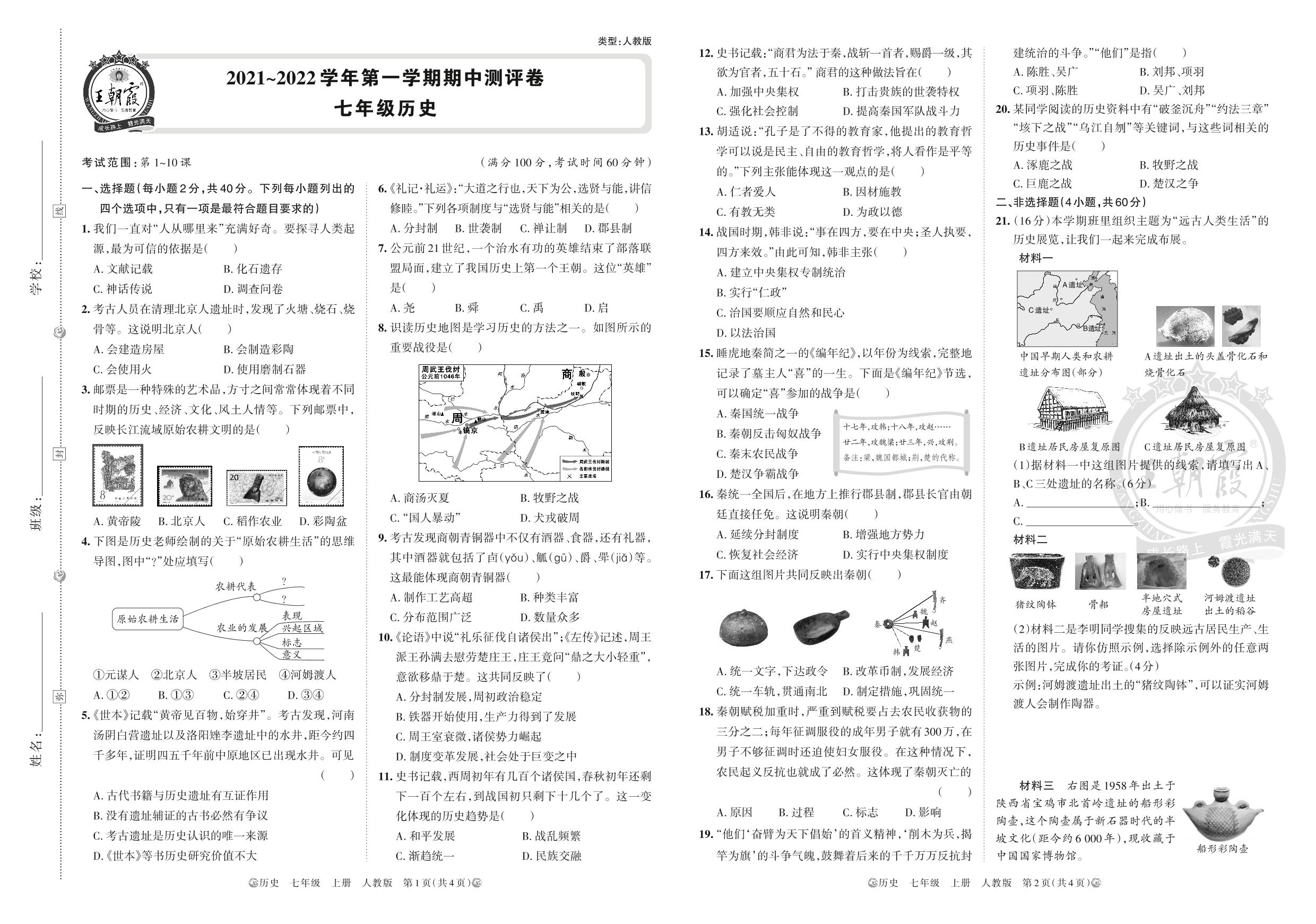 2021~2022学年第一学期期中测评卷 七年级历史(人教版)