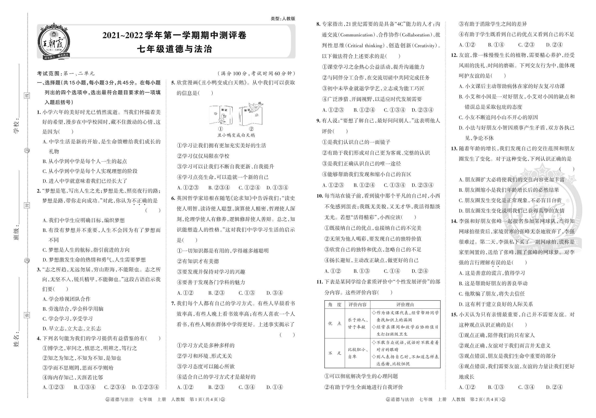 2021~2022学年第一学期期中测评卷 七年级道德与法治(人教版)