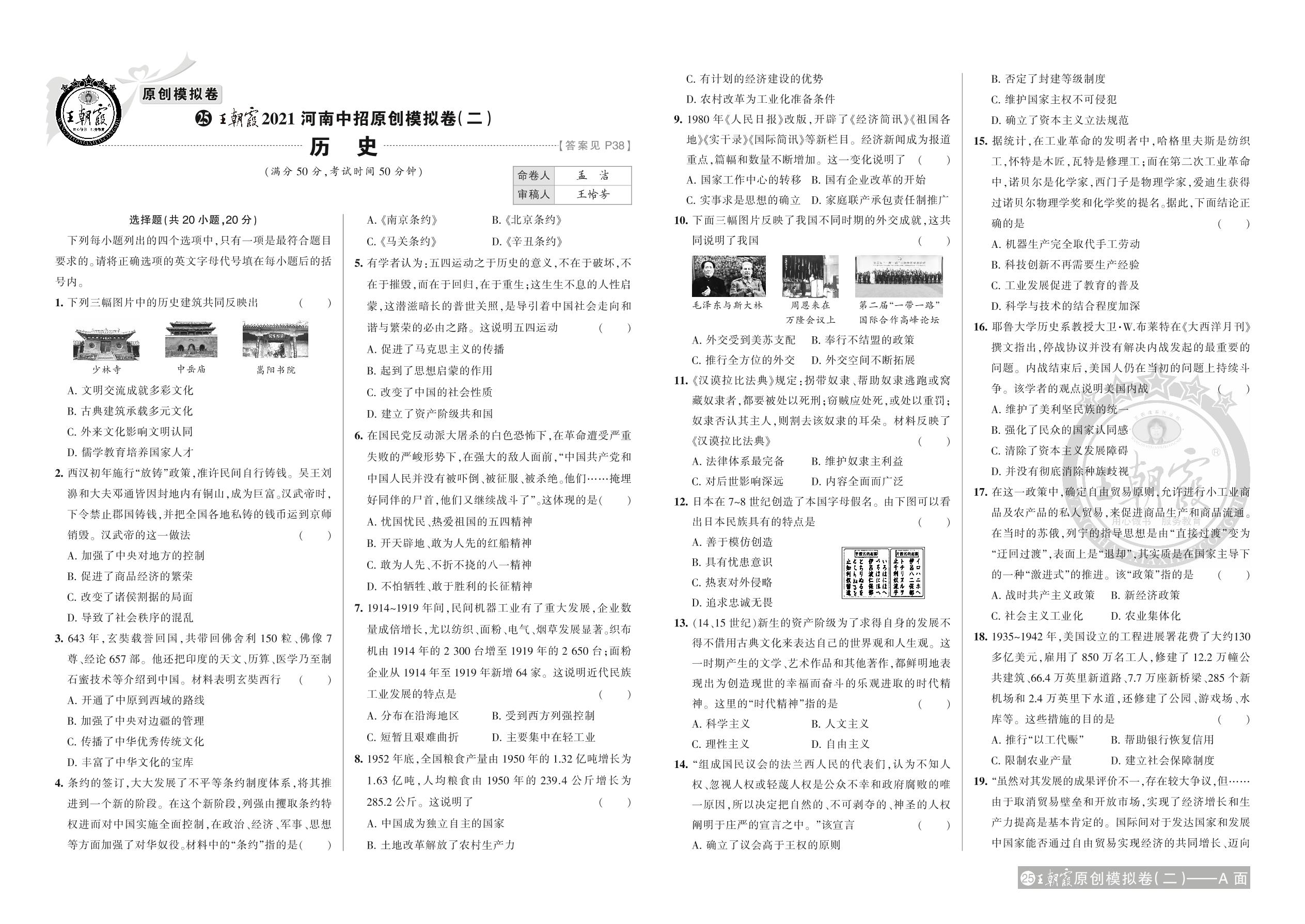 王朝霞2021河南中招原创模拟卷(二)历史【25】
