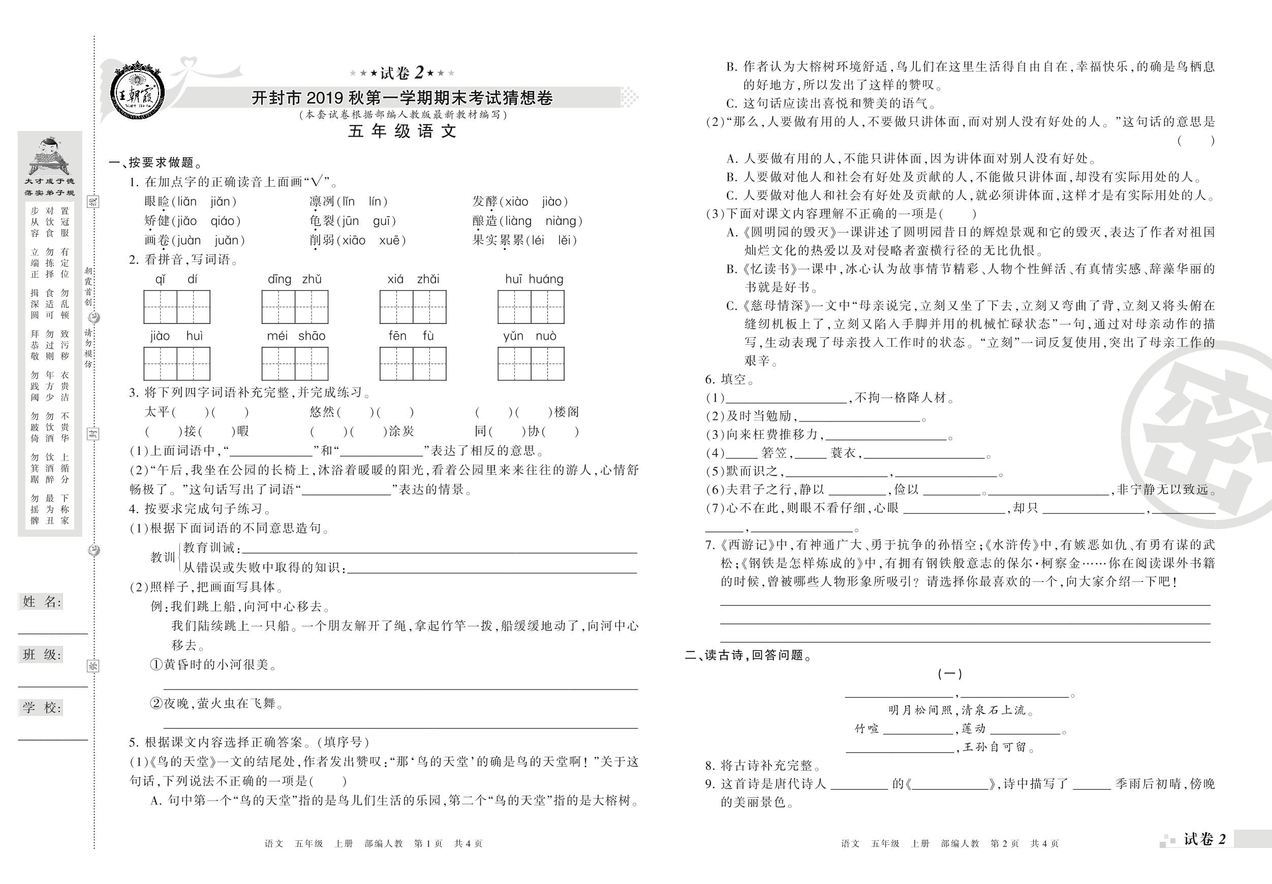 2019-2020学年第一学期开封市猜想卷五年级语文试卷(人教版)【2】