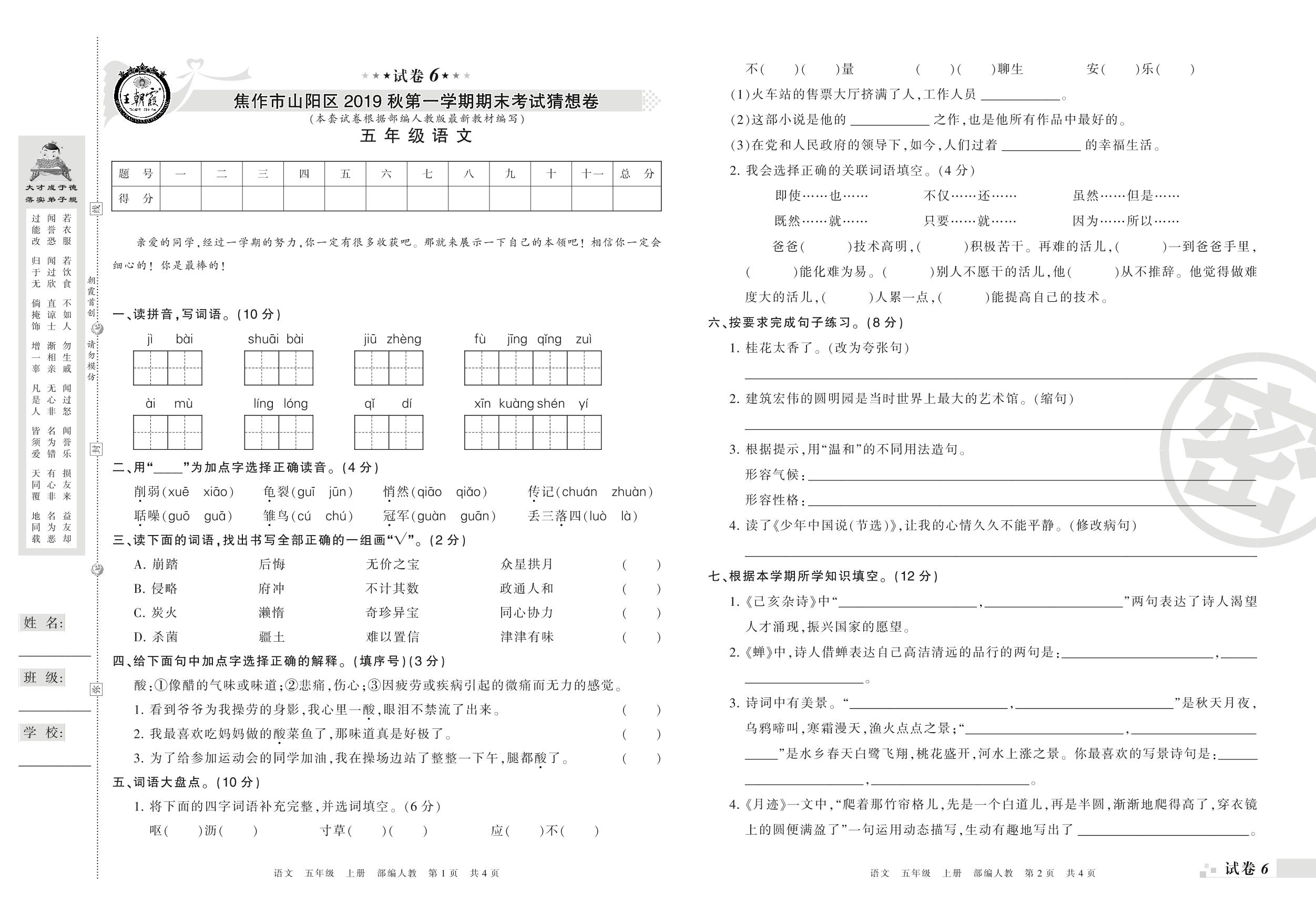 2019-2020学年第一学期焦作市山阳区猜想卷五年级语文试卷(人教版)【6】