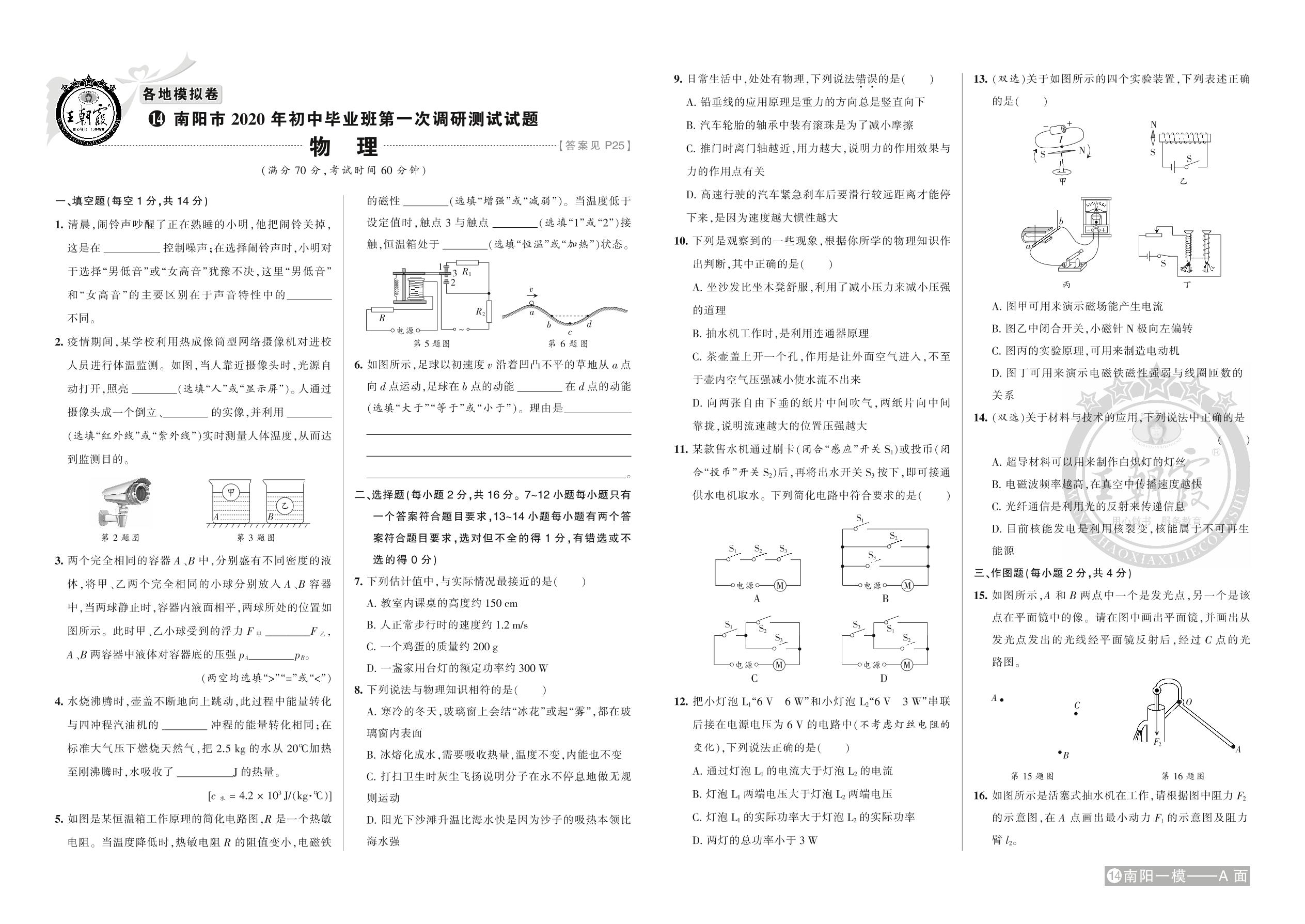 南阳市2020年初中毕业班第一次调研测试试题物理【14】
