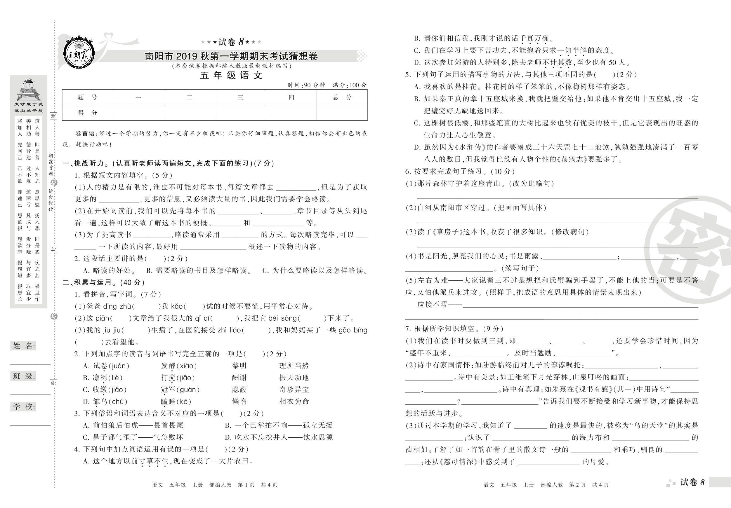 2019-2020学年第一学期南阳市猜想卷五年级语文试卷(人教版)【8】