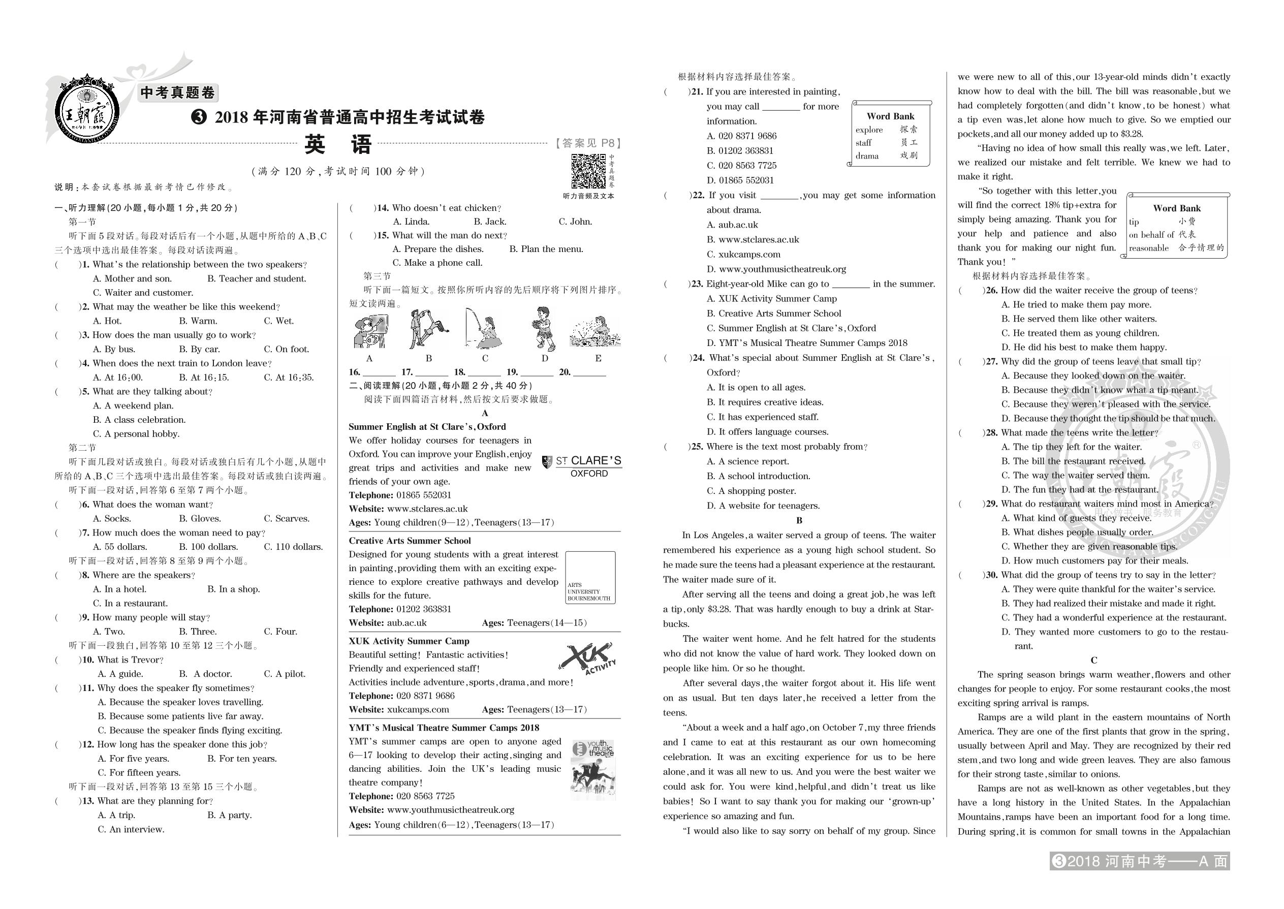 2018年河南省普通高中招生考试试卷英语【3】