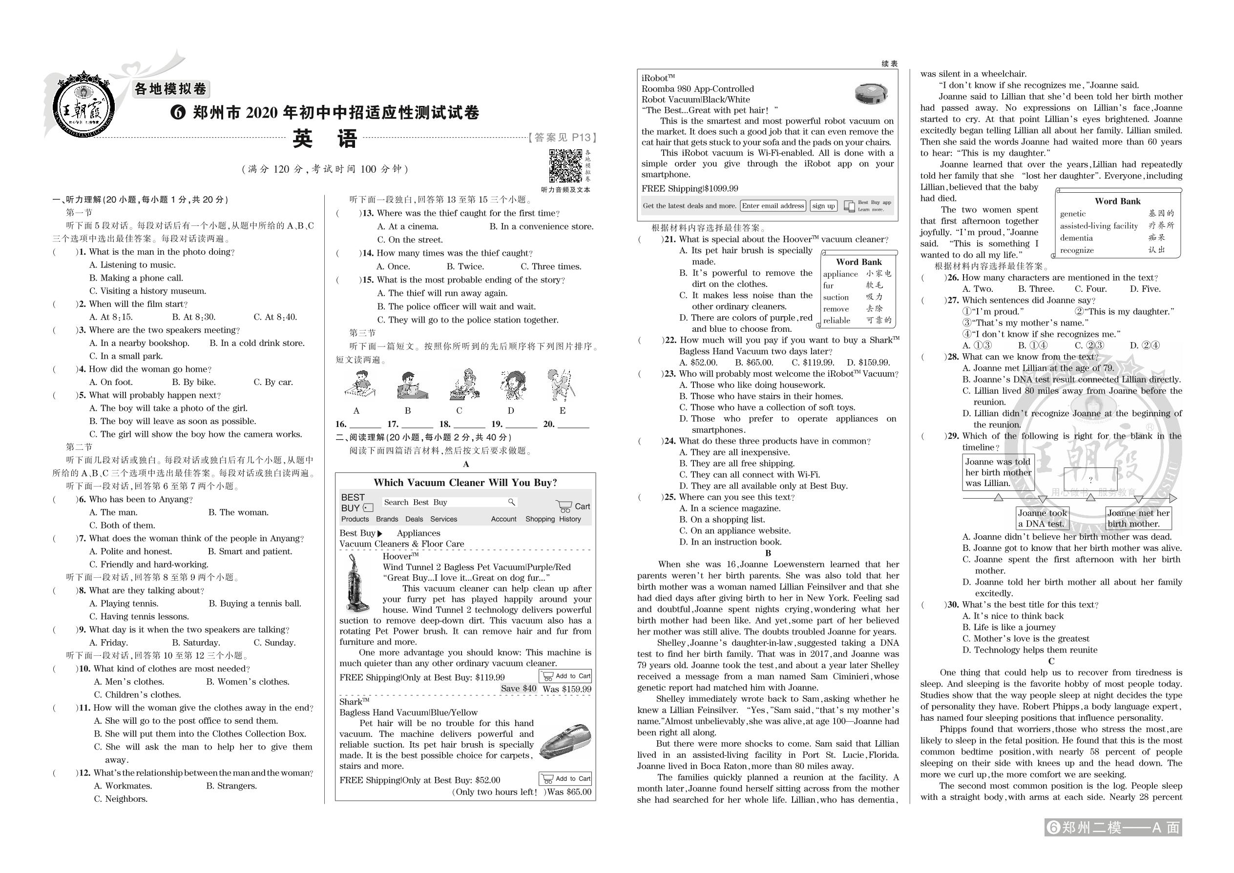 郑州市2020年初中中招适应性测试试卷英语【6】