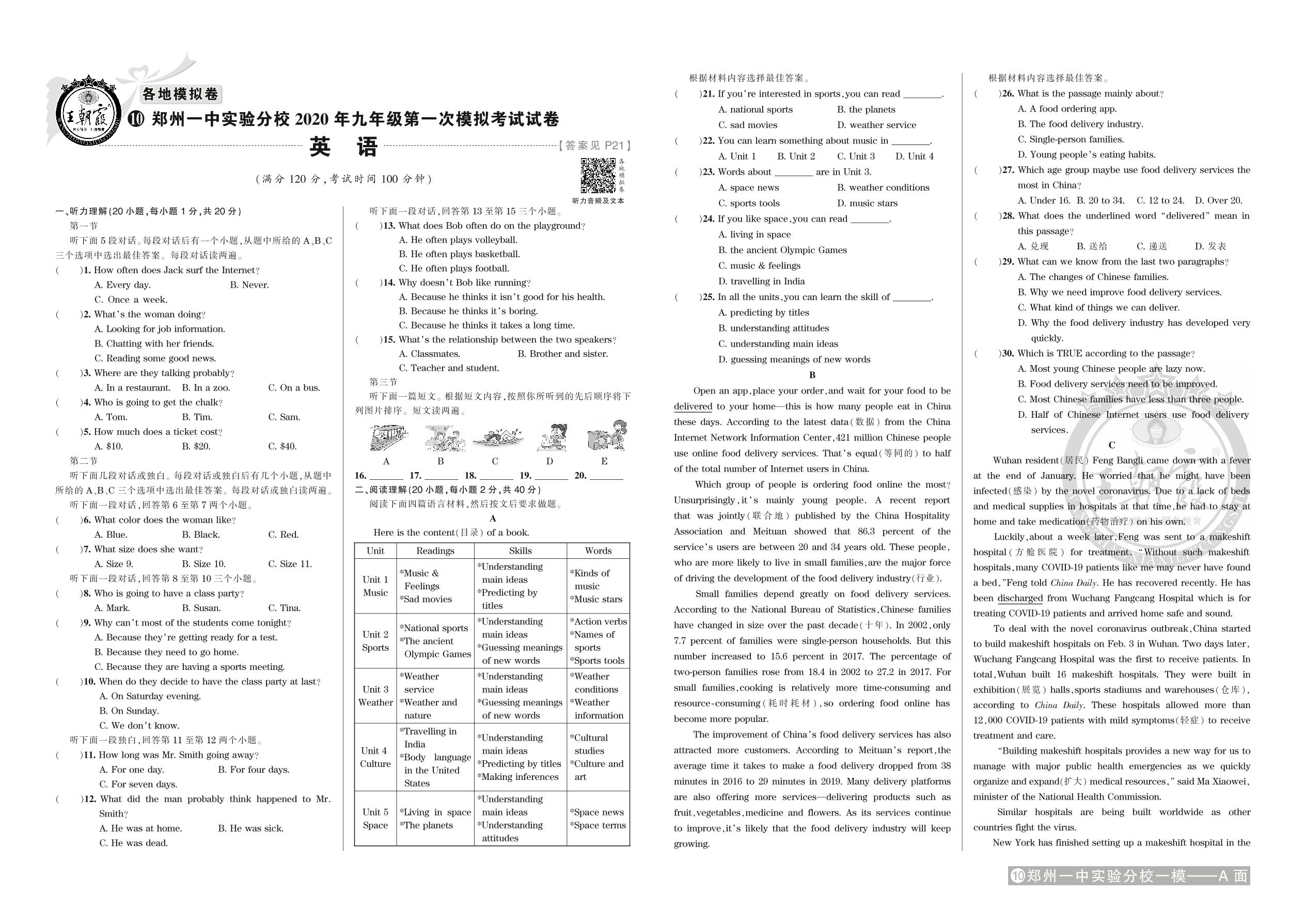 郑州一中实验分校2020年九年级第一次模拟考试试卷英语【10】