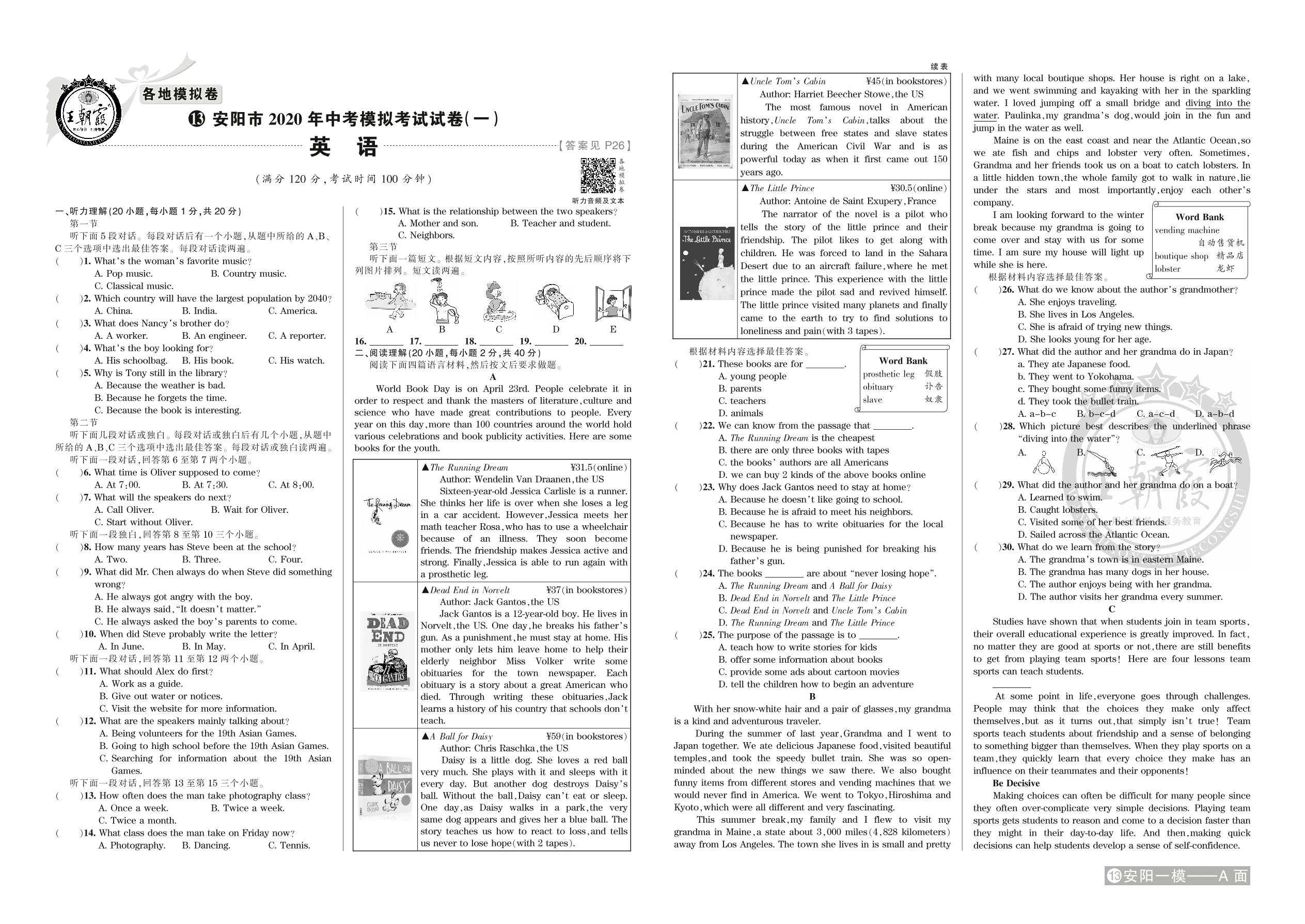 安阳市2020年中考模拟考试试卷(一)英语【13】