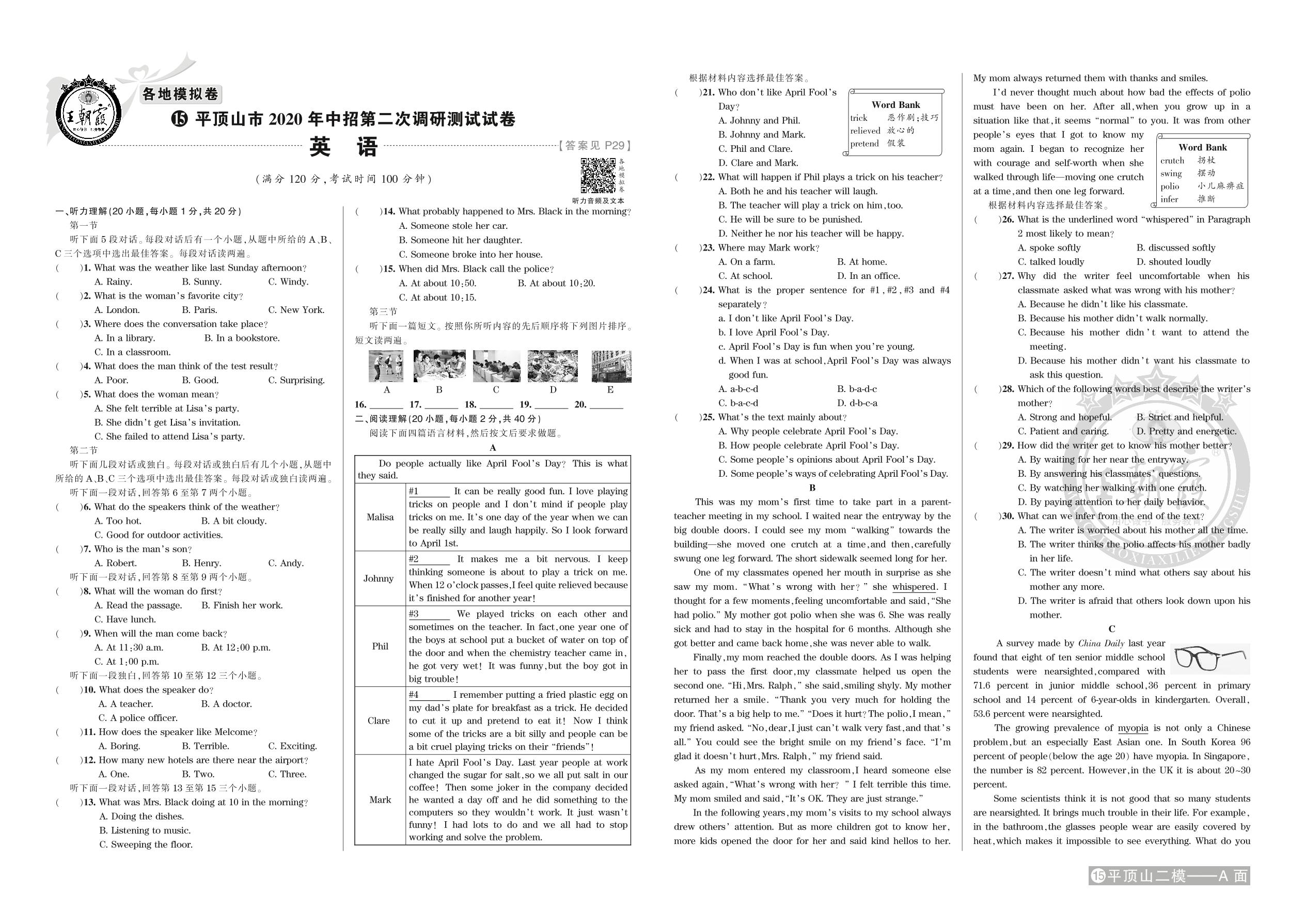 平顶山市2020年中招第二次调研测试试卷英语【15】