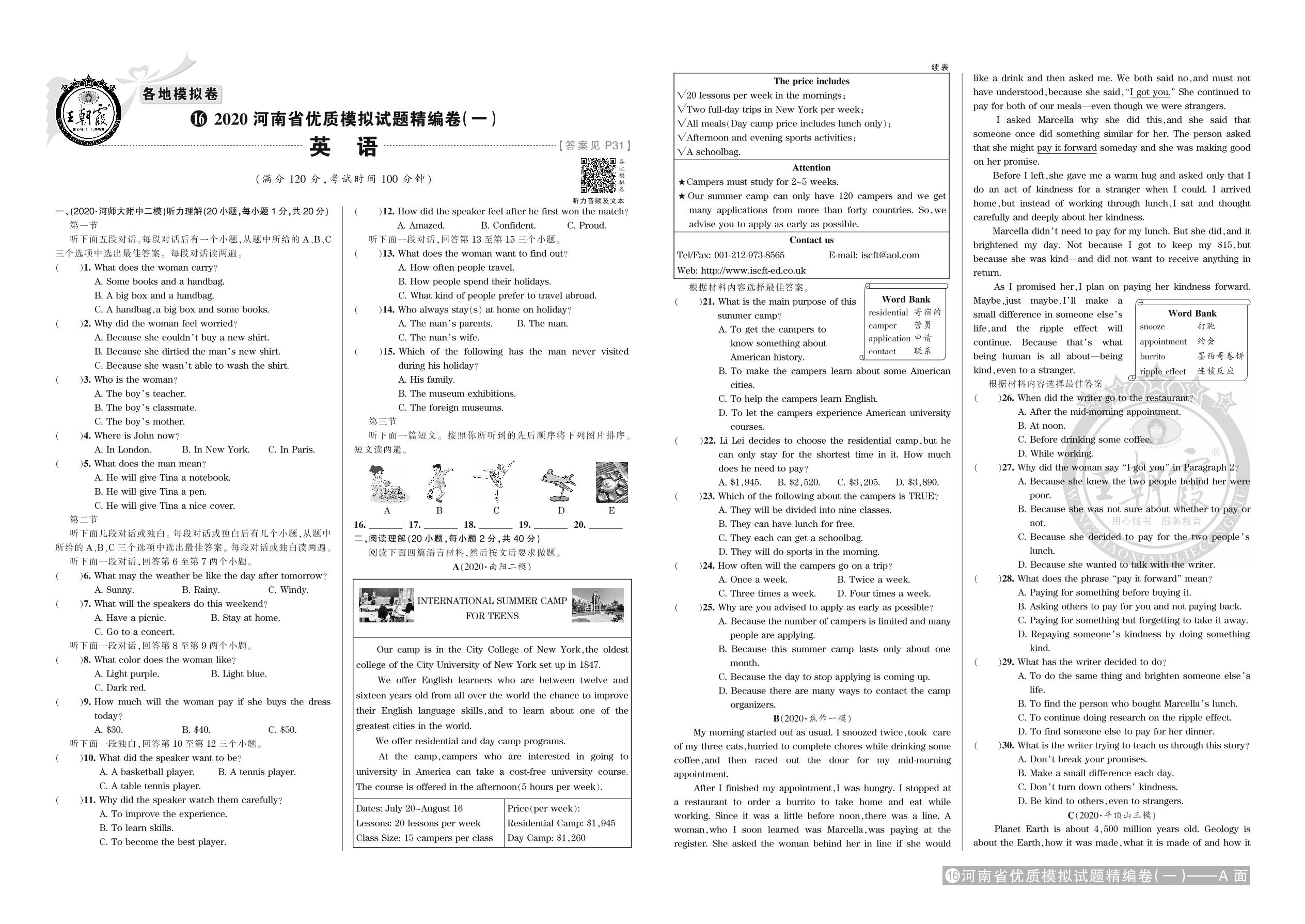 2020河南省优质模拟试题精编卷(一)英语【16】