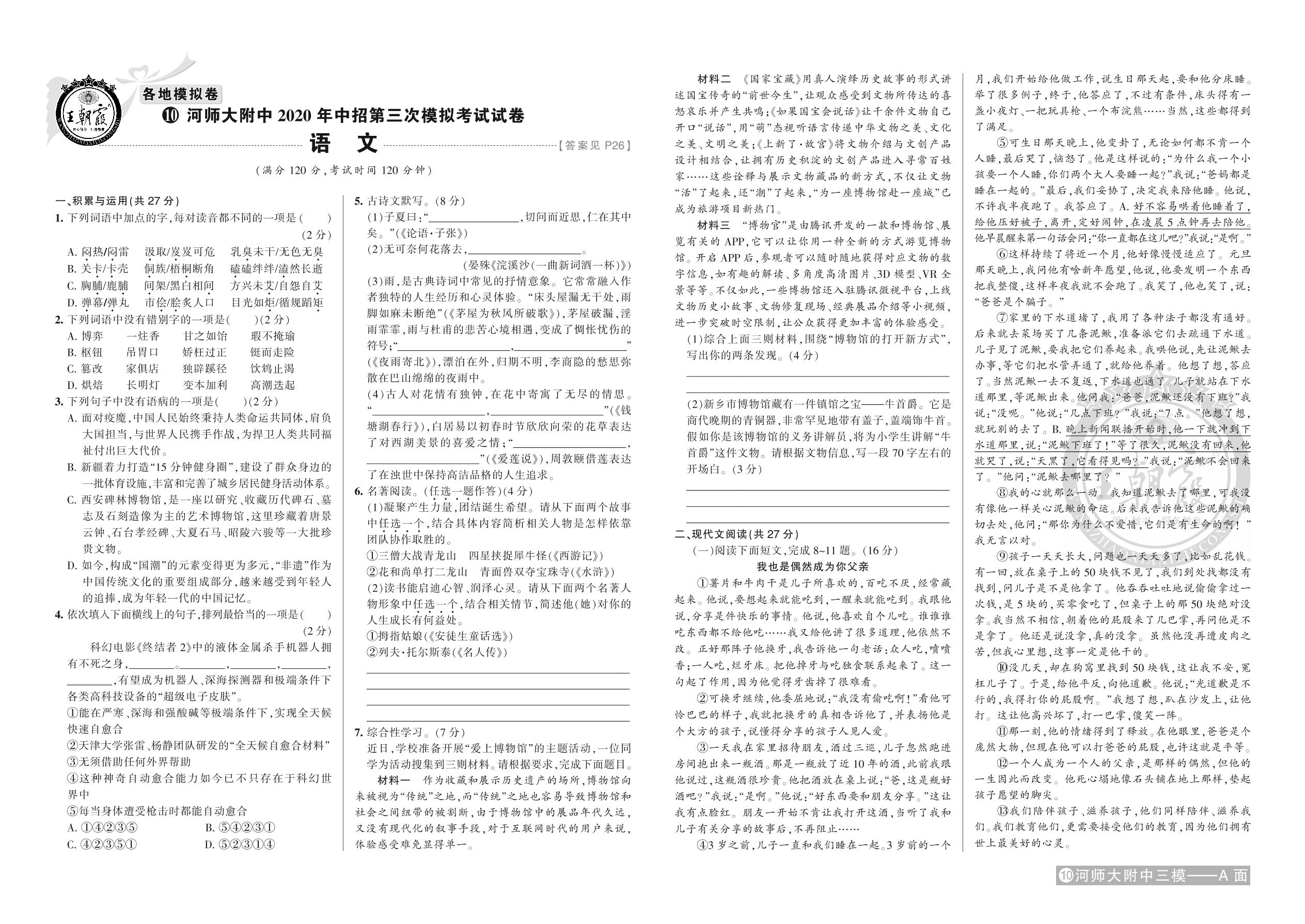 河师大附中2020年中招第三次模拟考试试卷语文【10】
