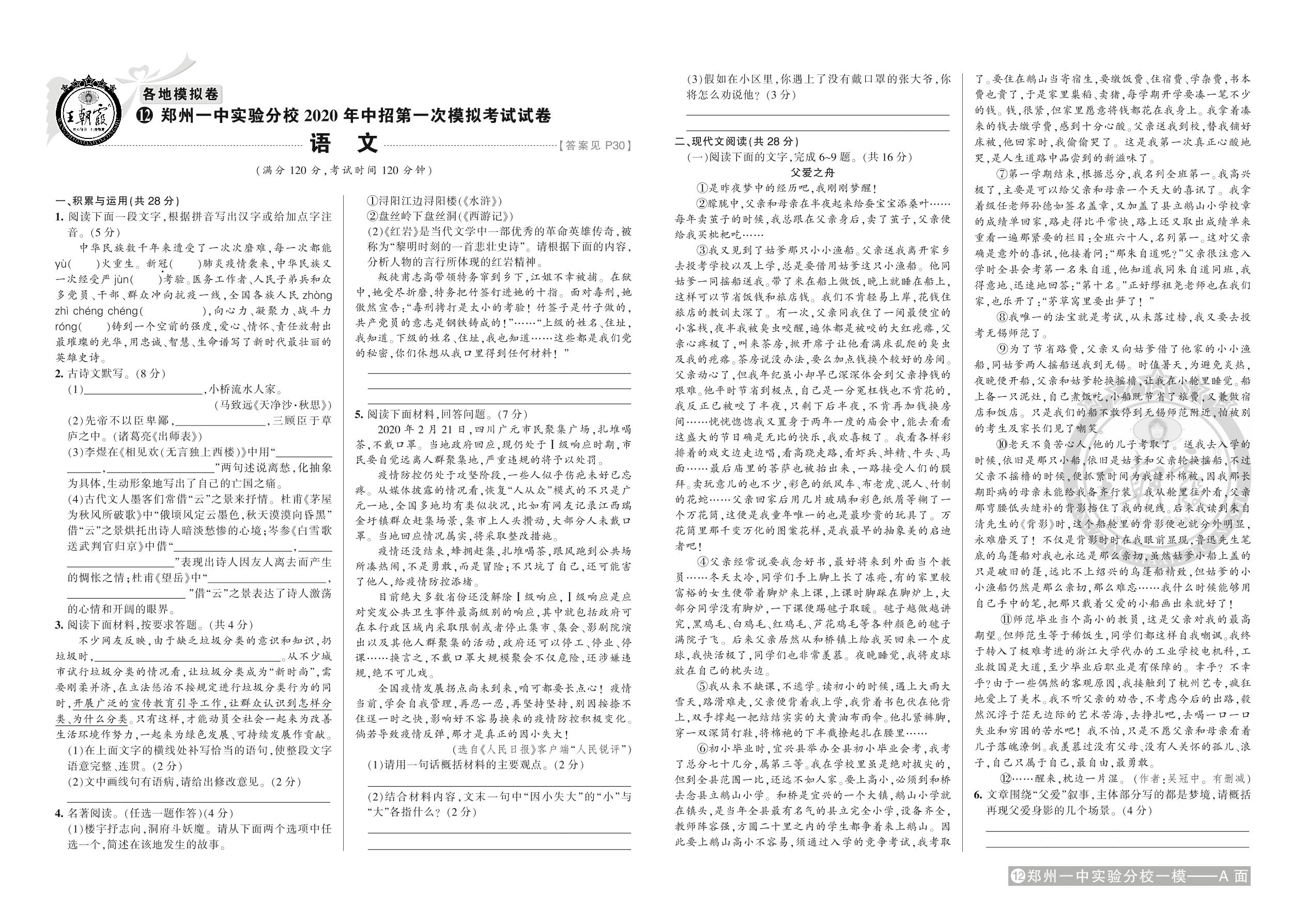 郑州一中实验分校2020年中招第一次模拟考试试卷语文【12】