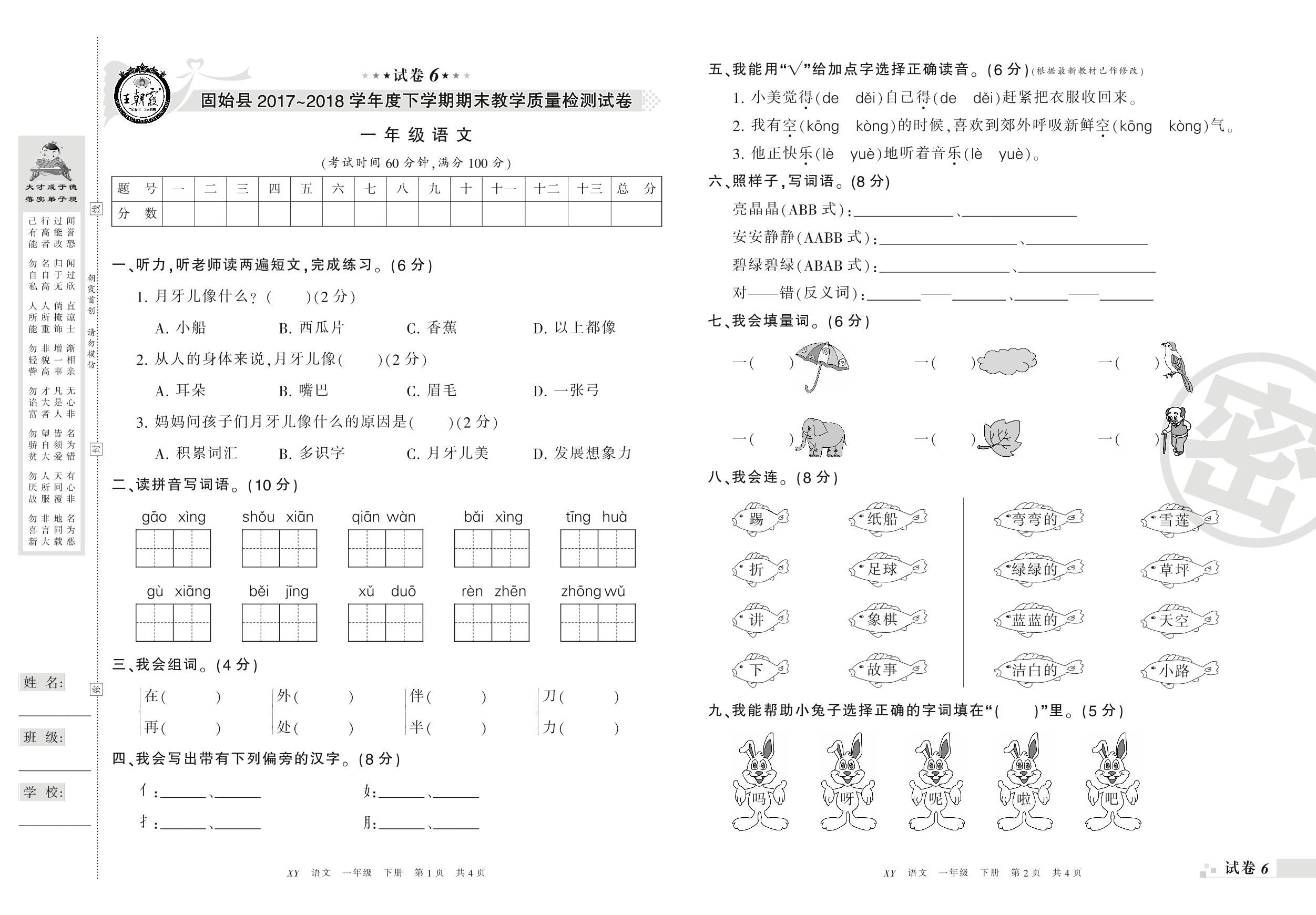 2017-2018学年第二学期信阳市固始县一年级语文试卷(人教版)【6】