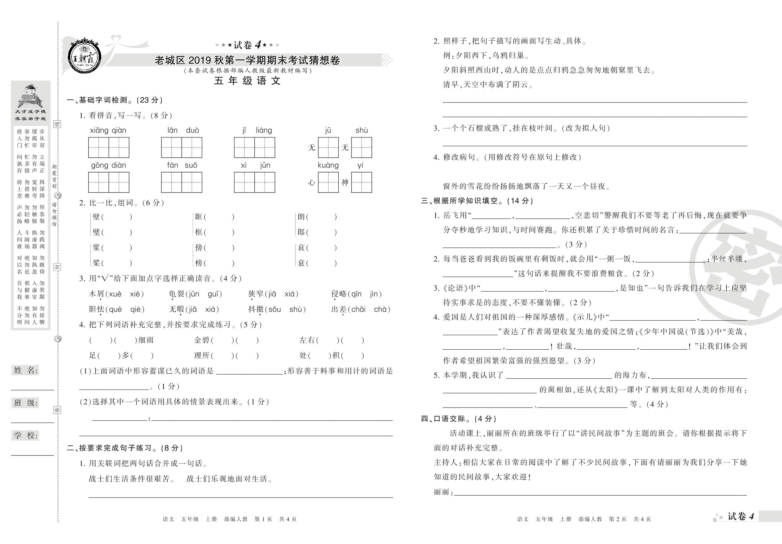 2019-2020学年第一学期洛阳市老城区猜想卷五年级语文试卷(人教版)【4】