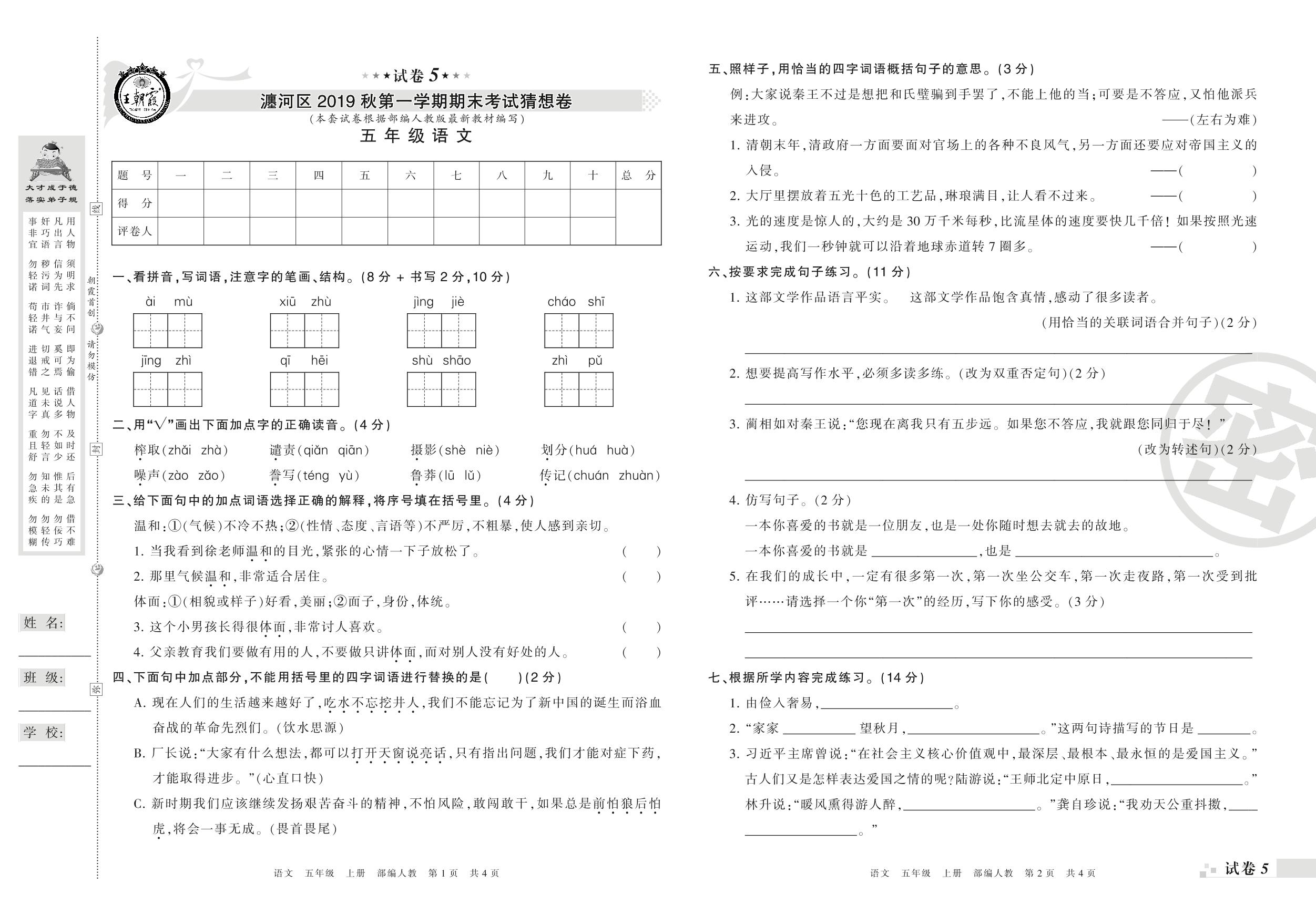 2019-2020学年第一学期洛阳市瀍河区猜想卷五年级语文试卷(人教版)【5】