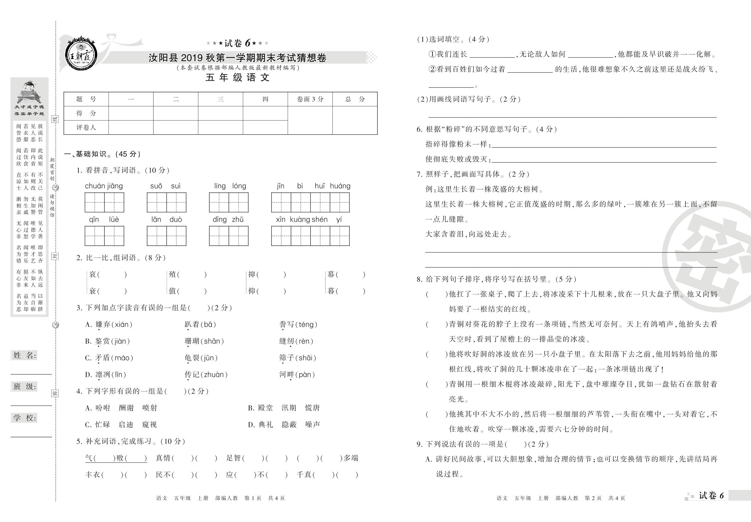 2019-2020学年第一学期洛阳市汝阳县猜想卷五年级语文试卷(人教版)【6】
