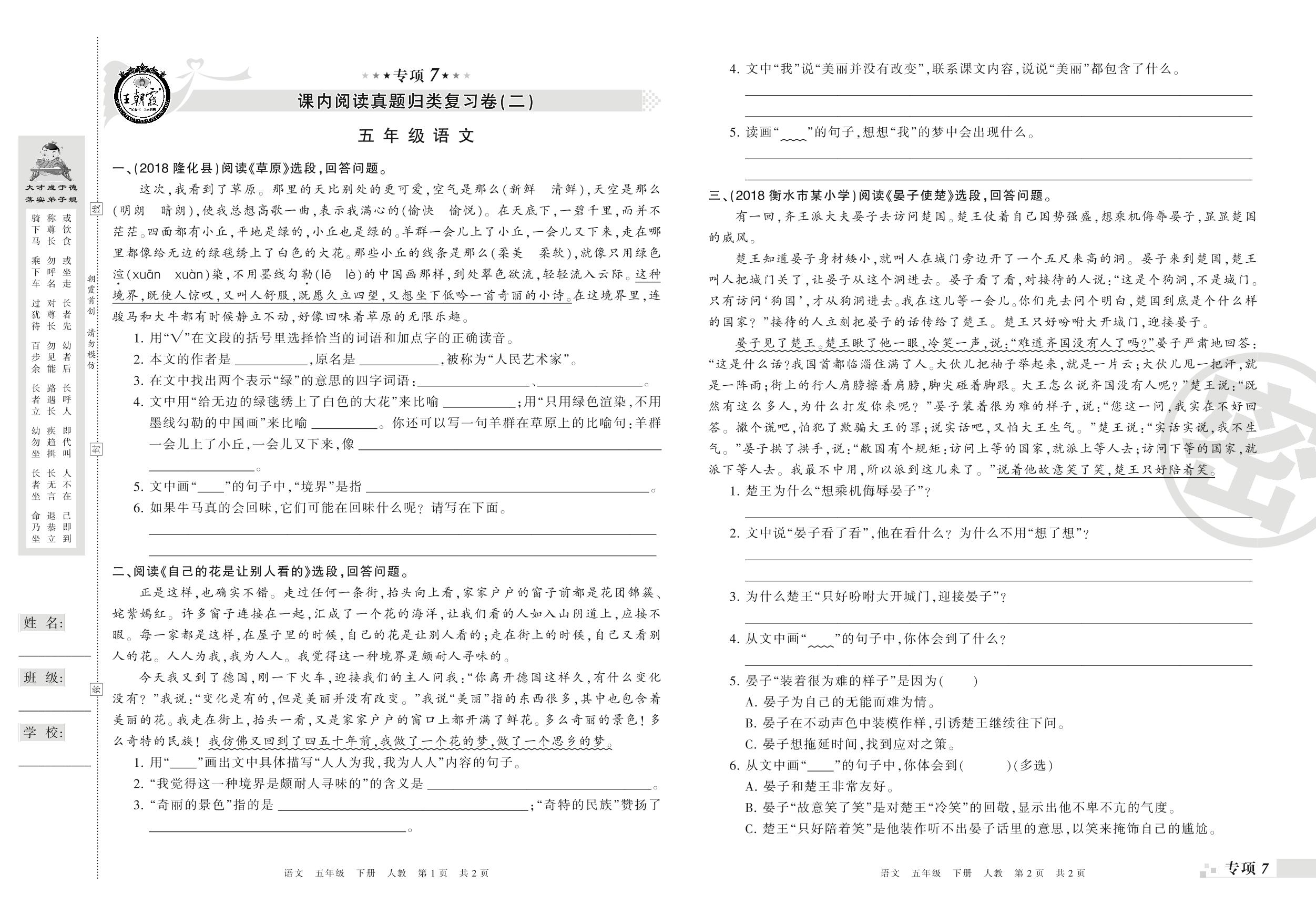 王朝霞期末专项卷——课内阅读、课外阅读与写作真题归类复习五年级下册语文(人教版)【0】