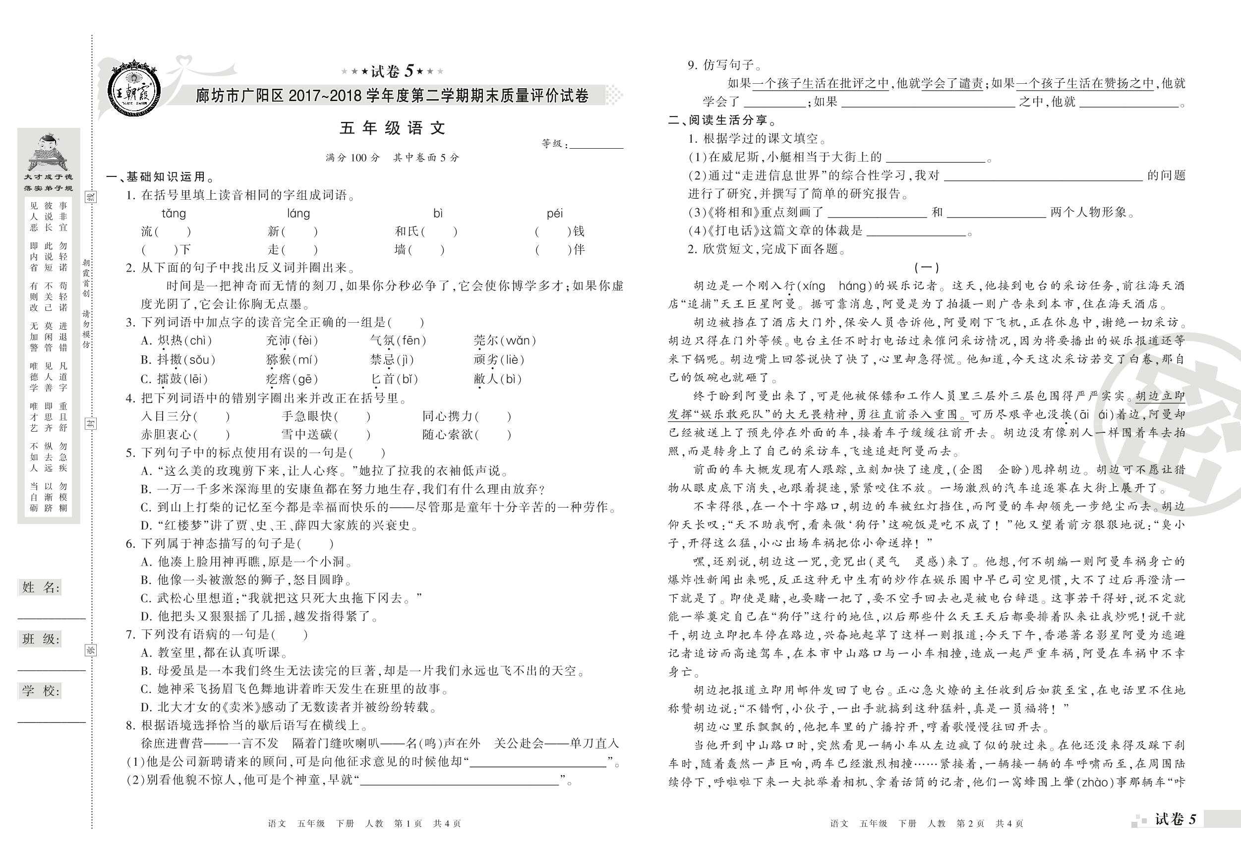 2017-2018学年第二学期廊坊市广阳区五年级语文试卷(人教版)【5】