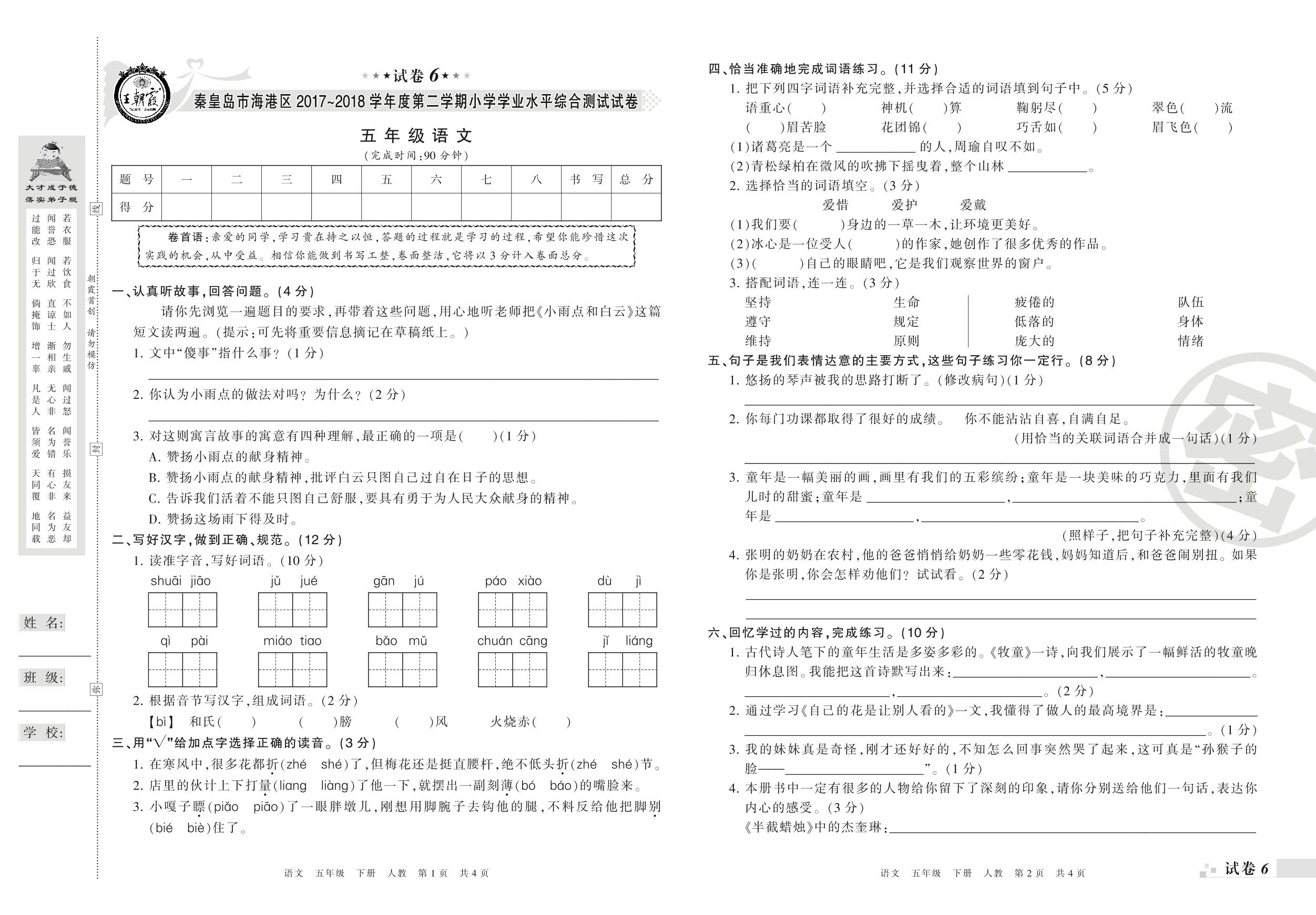 2017-2018学年第二学期秦皇岛市海港区五年级语文试卷(人教版)【6】