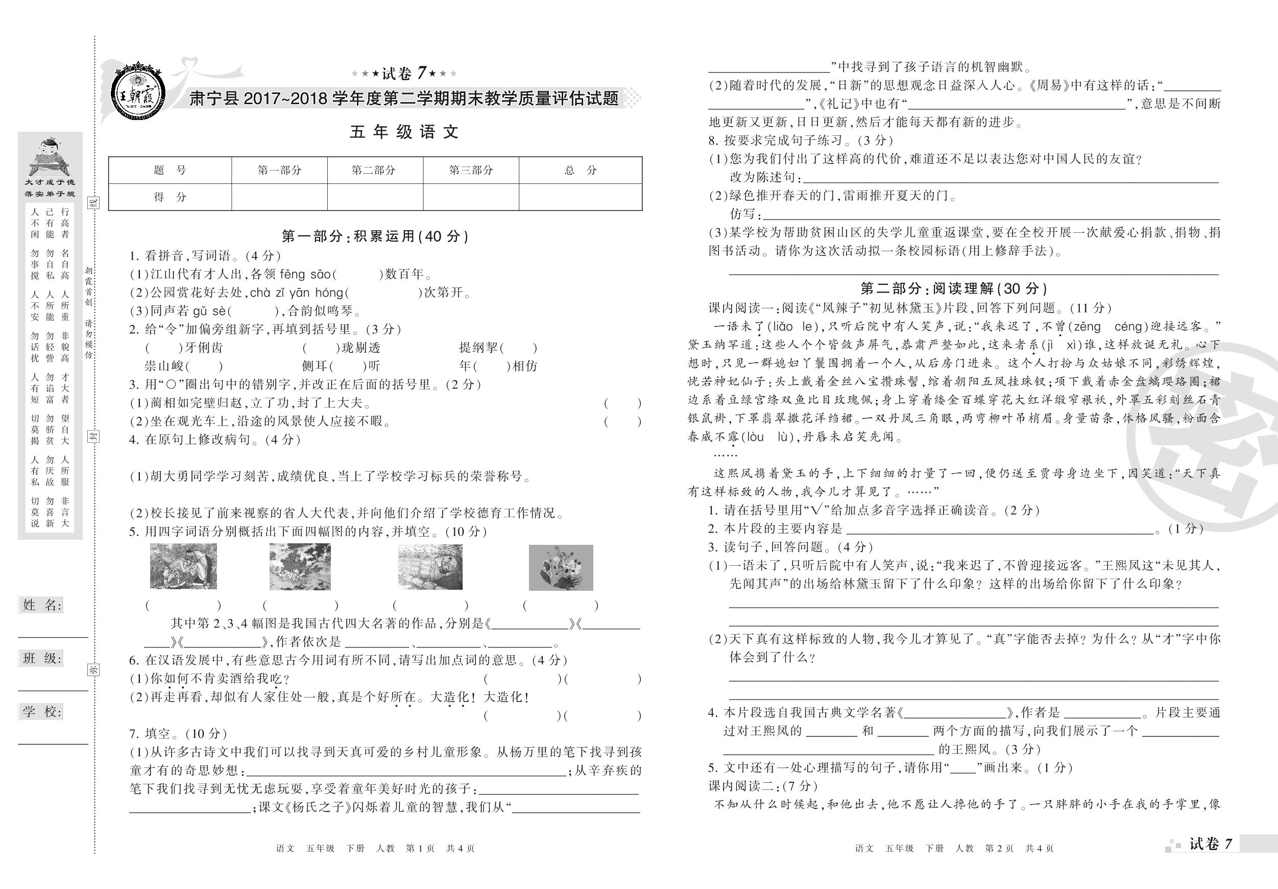 2017-2018学年第二学期沧州市肃宁县五年级语文试卷(人教版)【7】