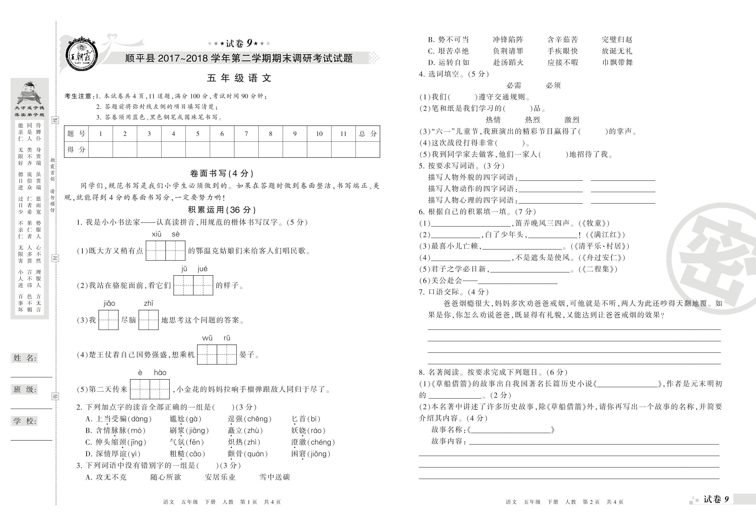 2017-2018学年第二学期保定市顺平县五年级语文试卷(人教版)【9】