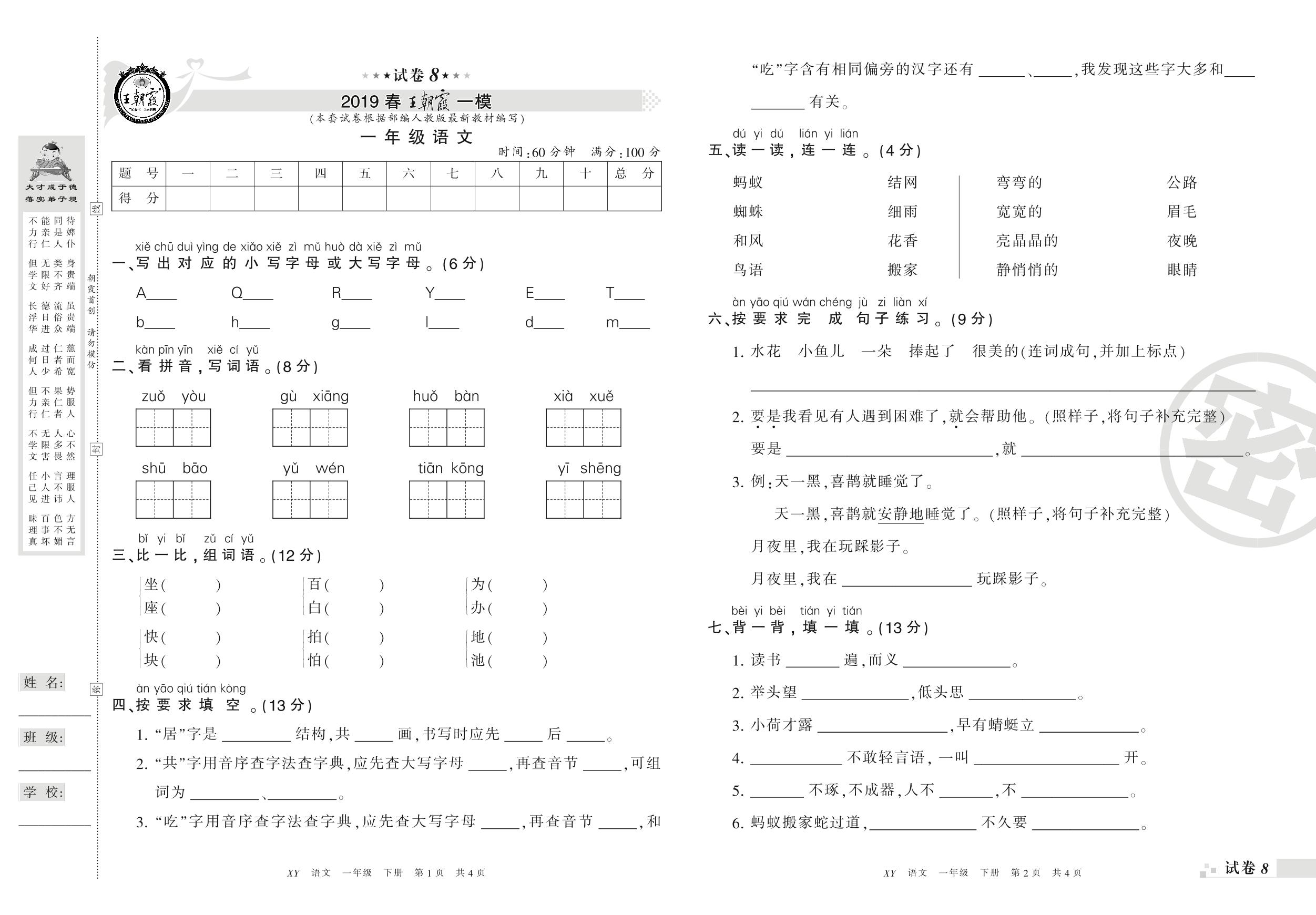 王朝霞期末模拟卷一年级下册语文(人教版)_R210731181432【8】